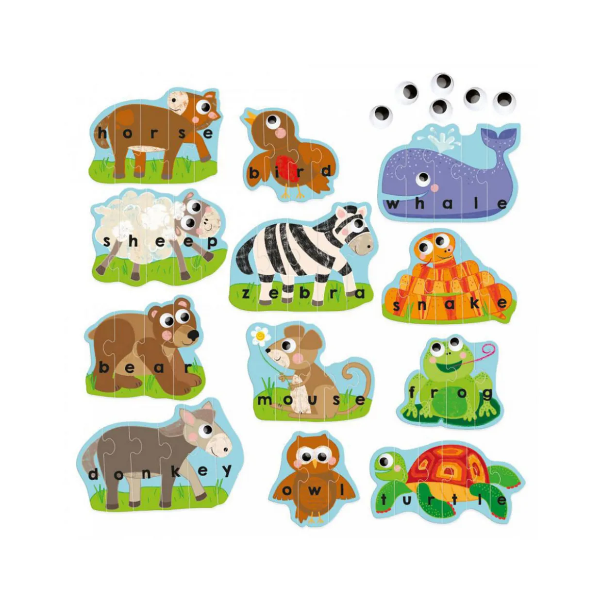 - 12 animal puzzles; 36 adhesive eyes. Suitable for ages 3-6.
