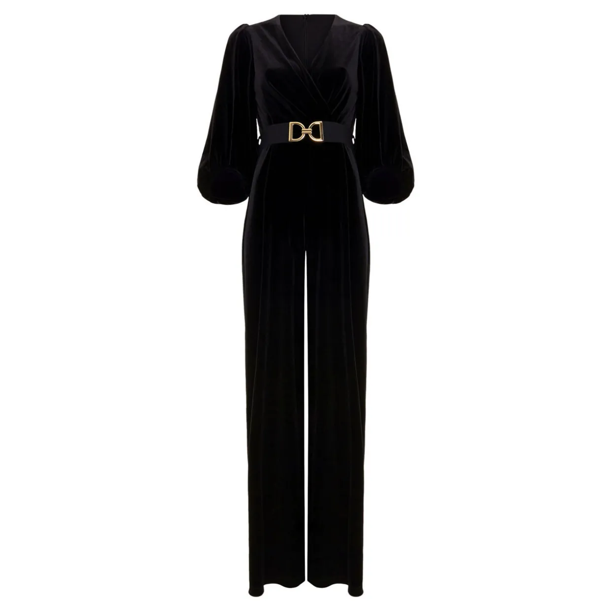 - V-neckline, wrap-style bodice, half-length balloon sleeves, rear zip fastening, belt loops with buckle fastening, gold-tone hardware, straight-leg, clean hems, velvet finish