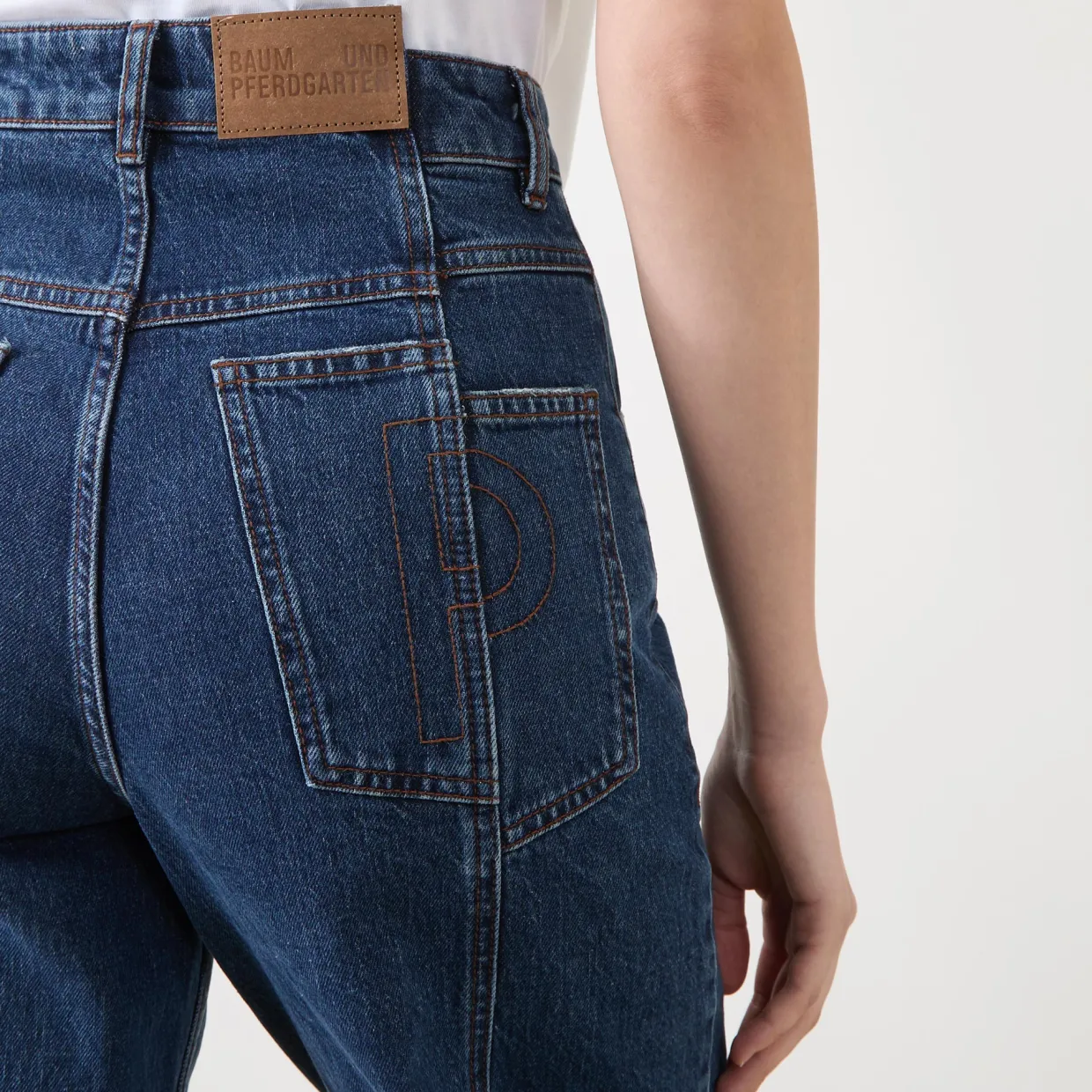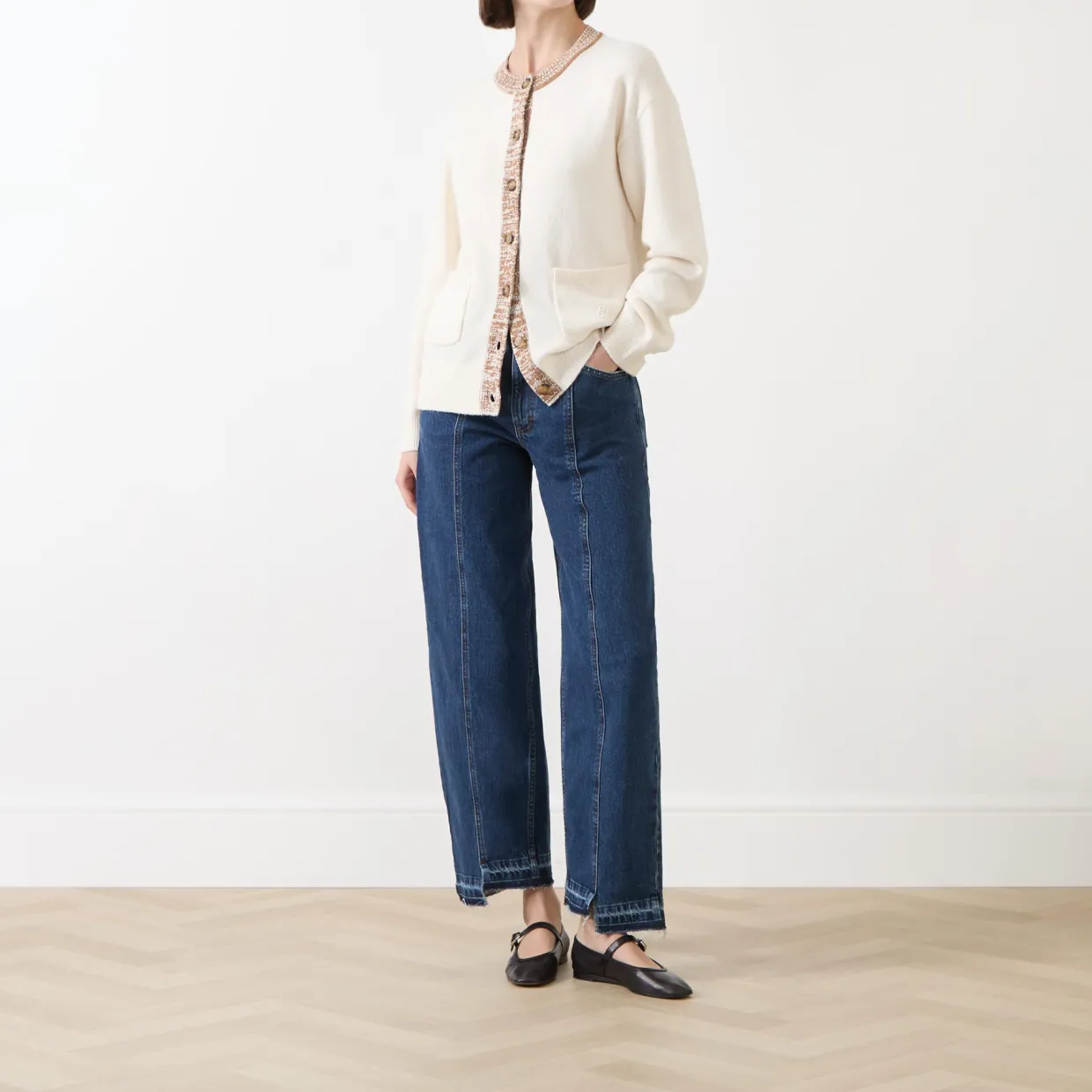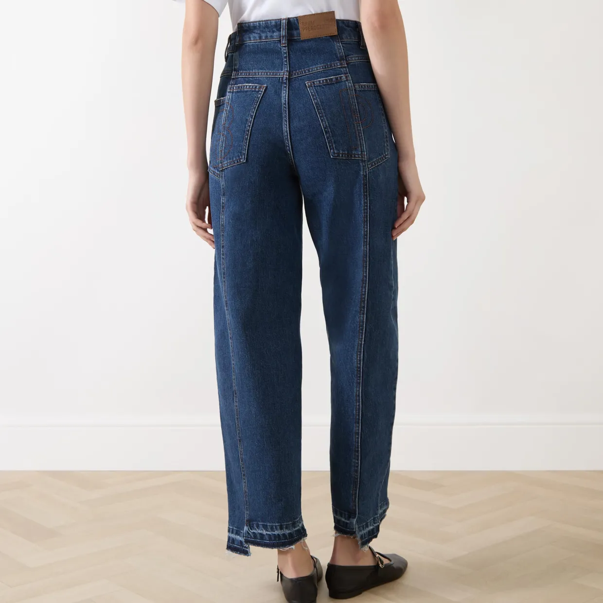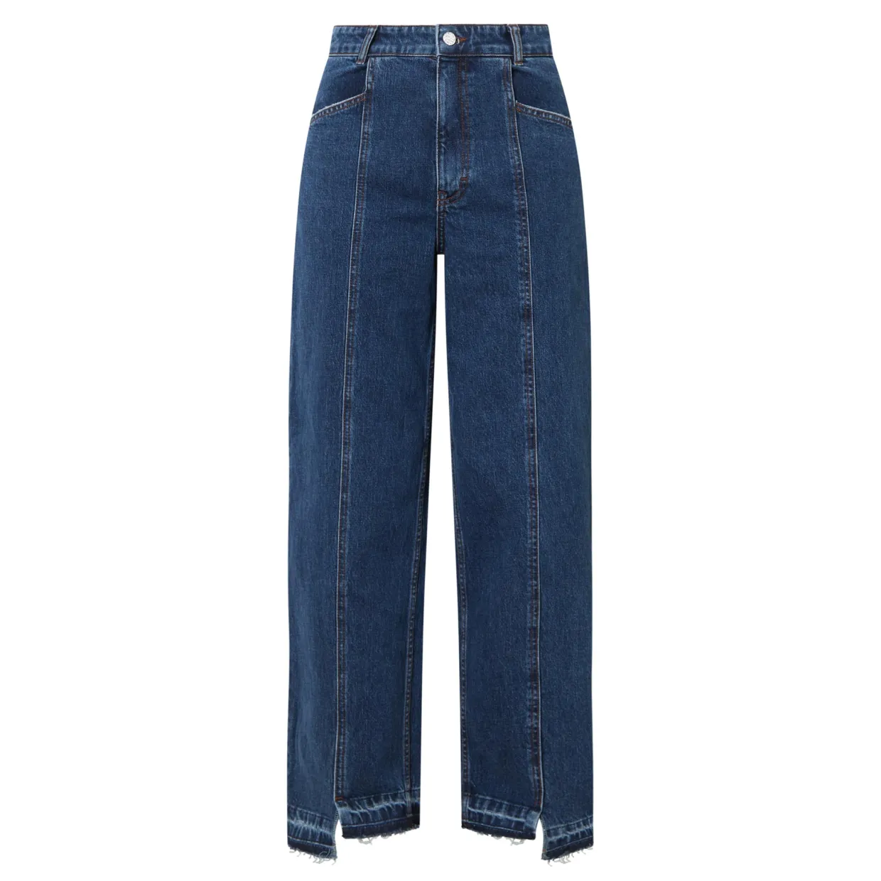 - Mid-rise, wide leg, full length, belt loops, concealed zip fly with button fastening, unique pocket design, visible seam detailing, split hems, raw edges, dark wash finish
