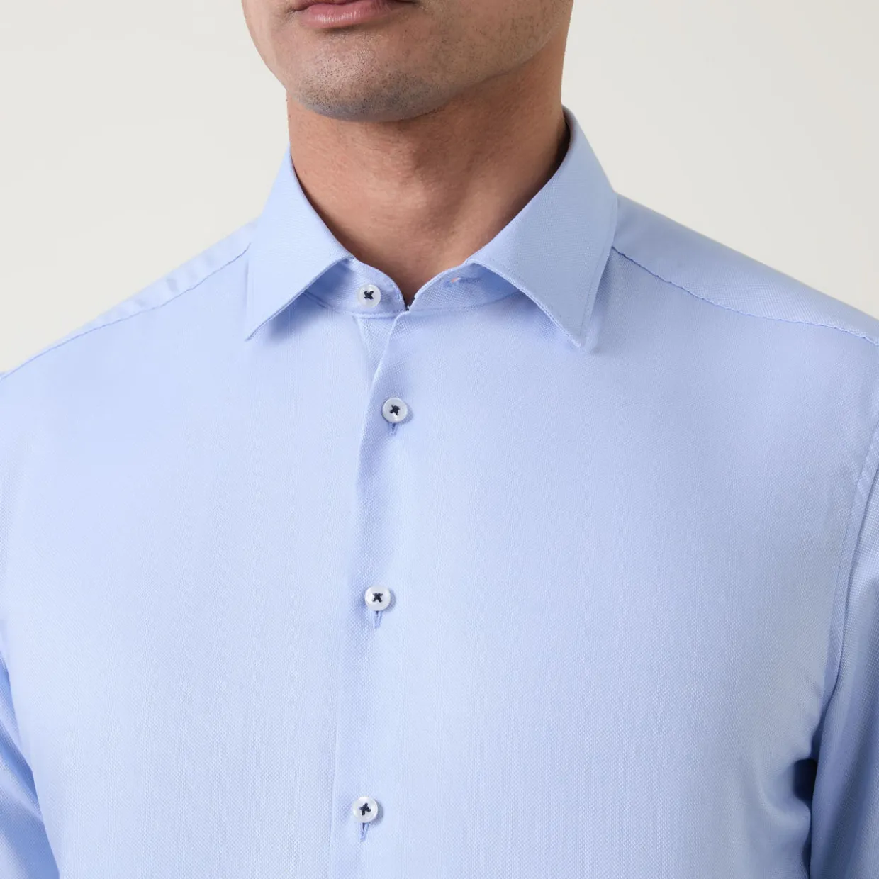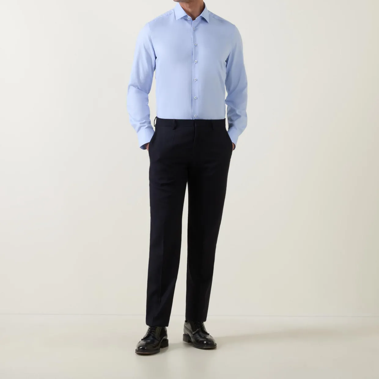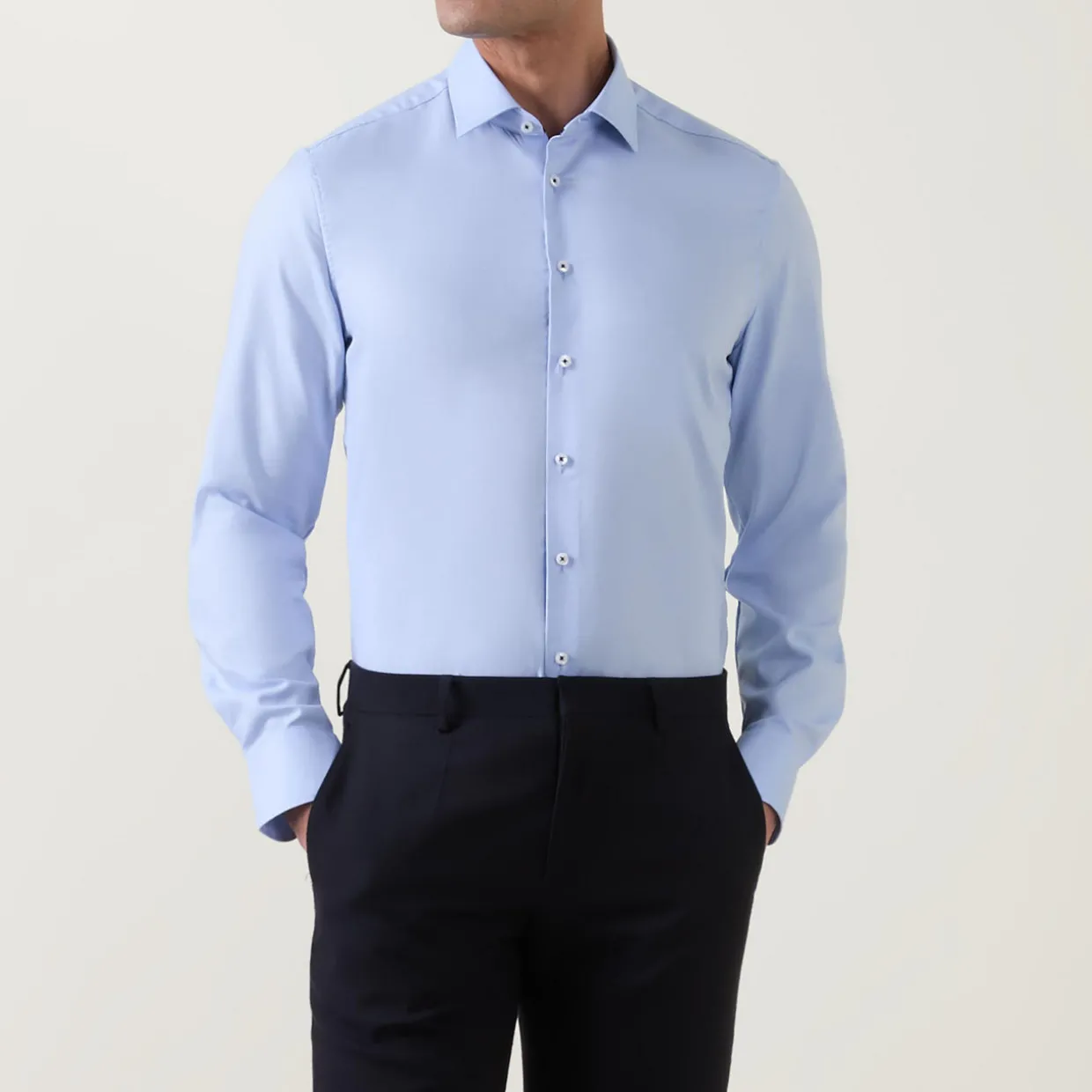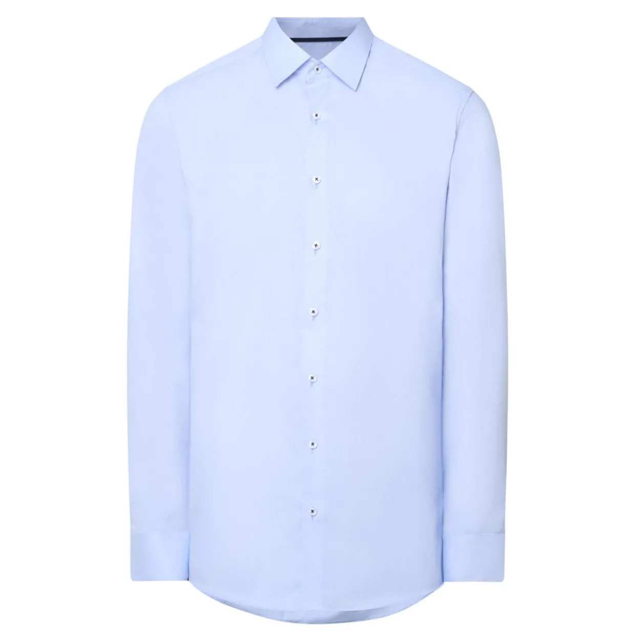 - Point collar, long sleeves, single button cuffs, front button fastening, curved hem, smooth finish