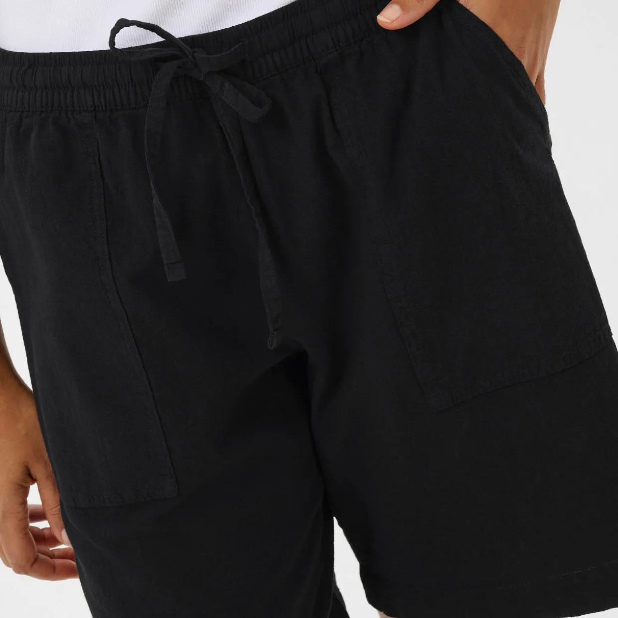 - Casual style, elasticated drawstring waistband, wide leg silhouette, patch side pockets, cut above the knees
