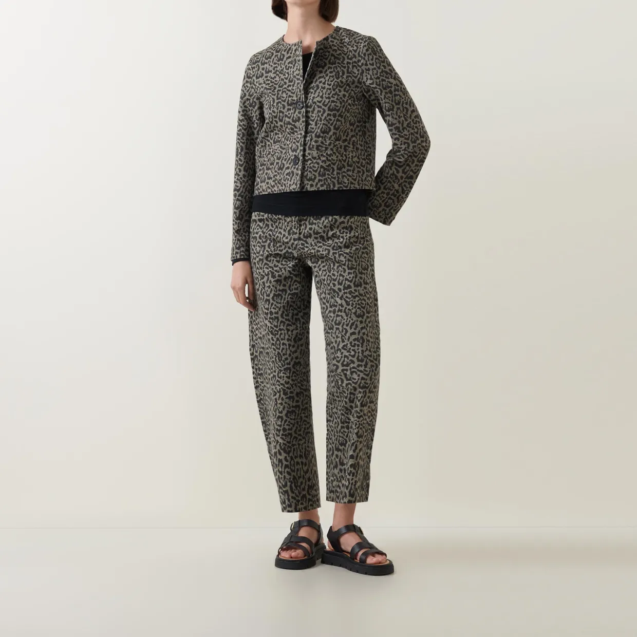 - Round neckline, long sleeves, button fastenings, slip pockets, leopard print, straight hemline