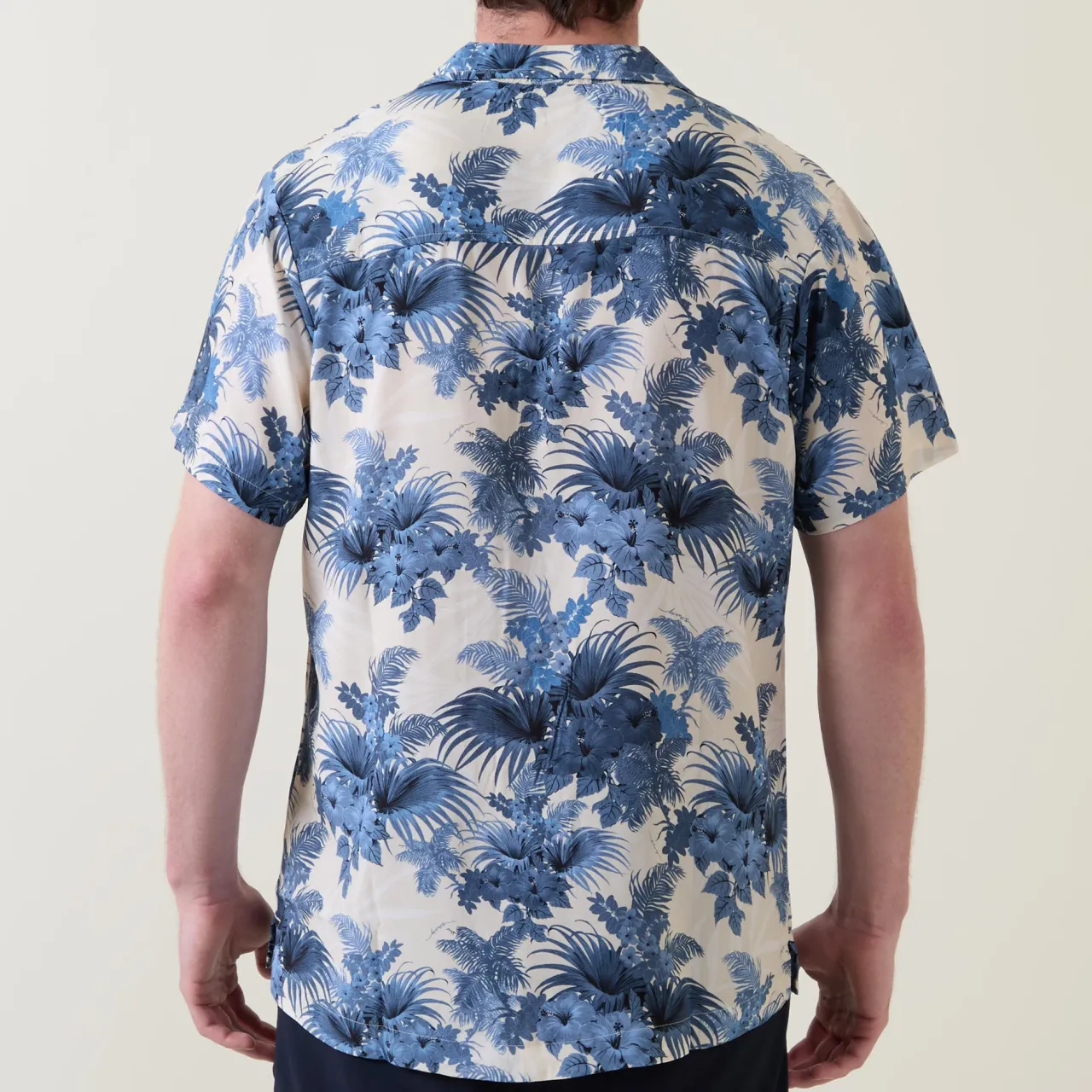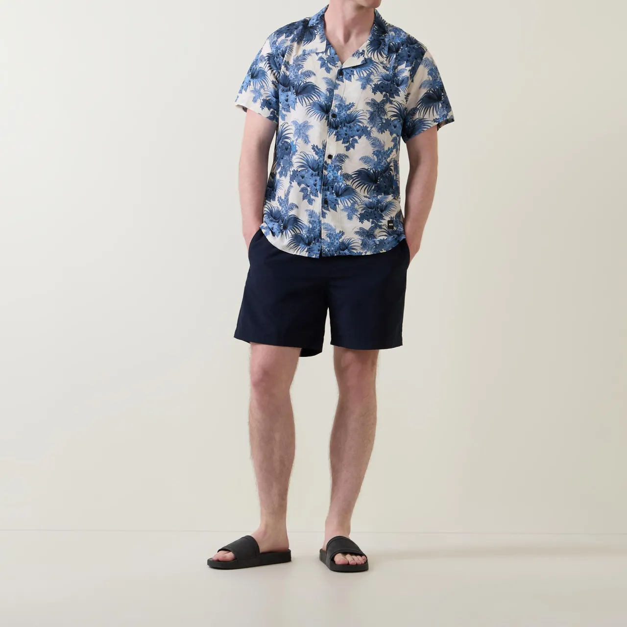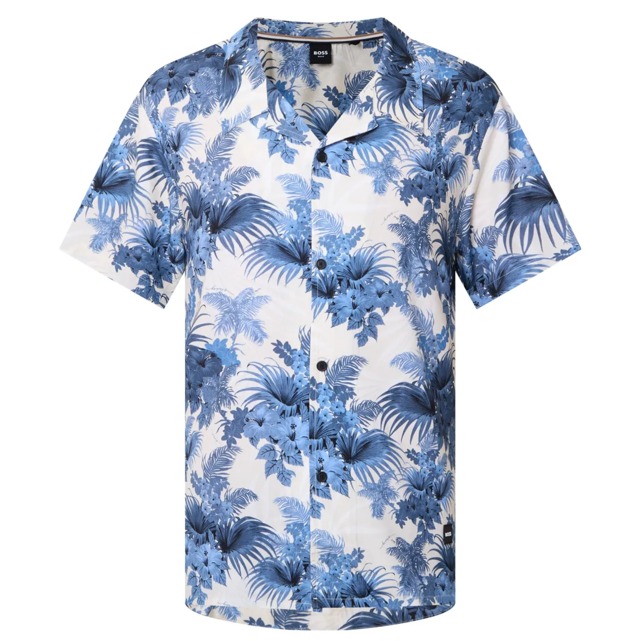 - Notched collar, short sleeves, button fastenings, beach print, straight hemline