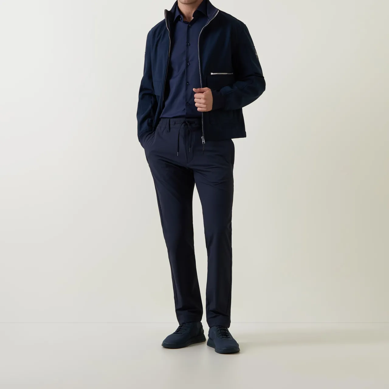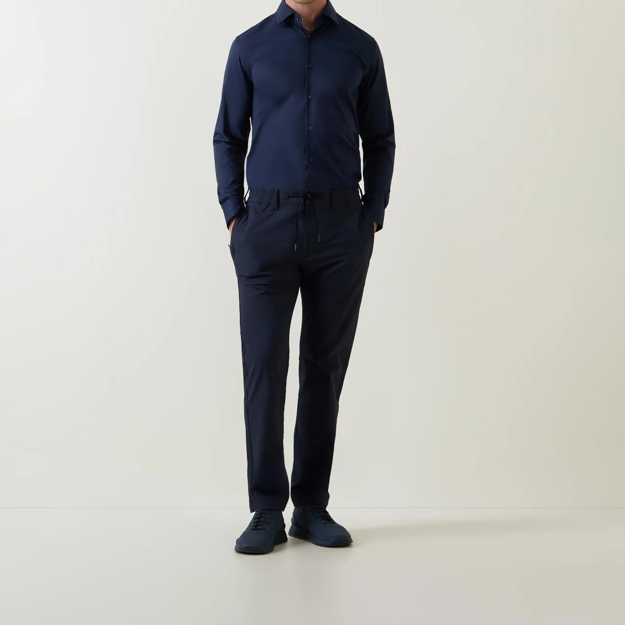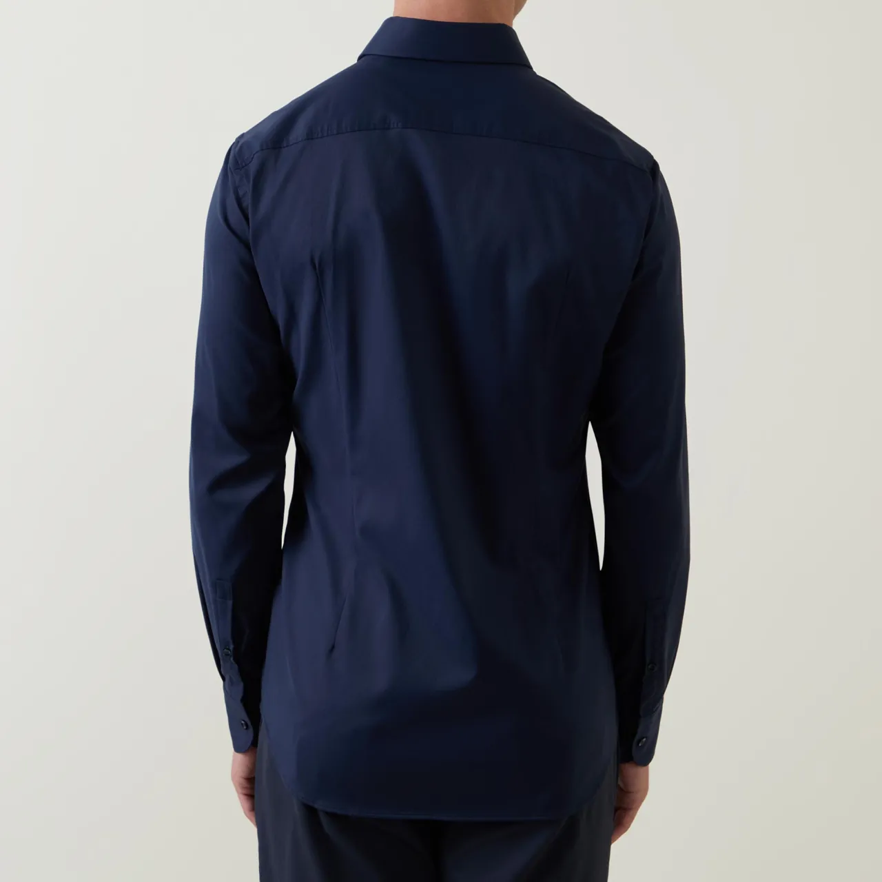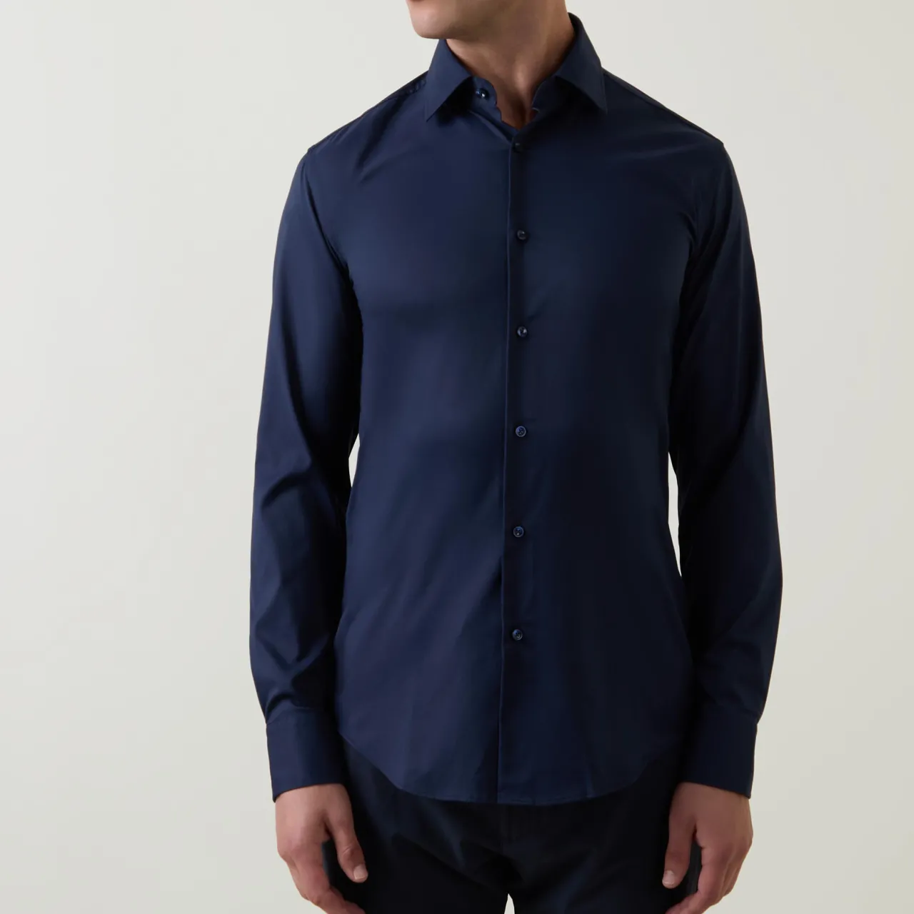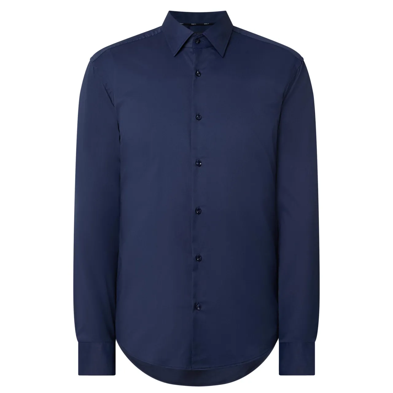 - Point collar, long sleeves, front button placket, single-button cuffs, tonal stitching, curved hemline, smooth fabric