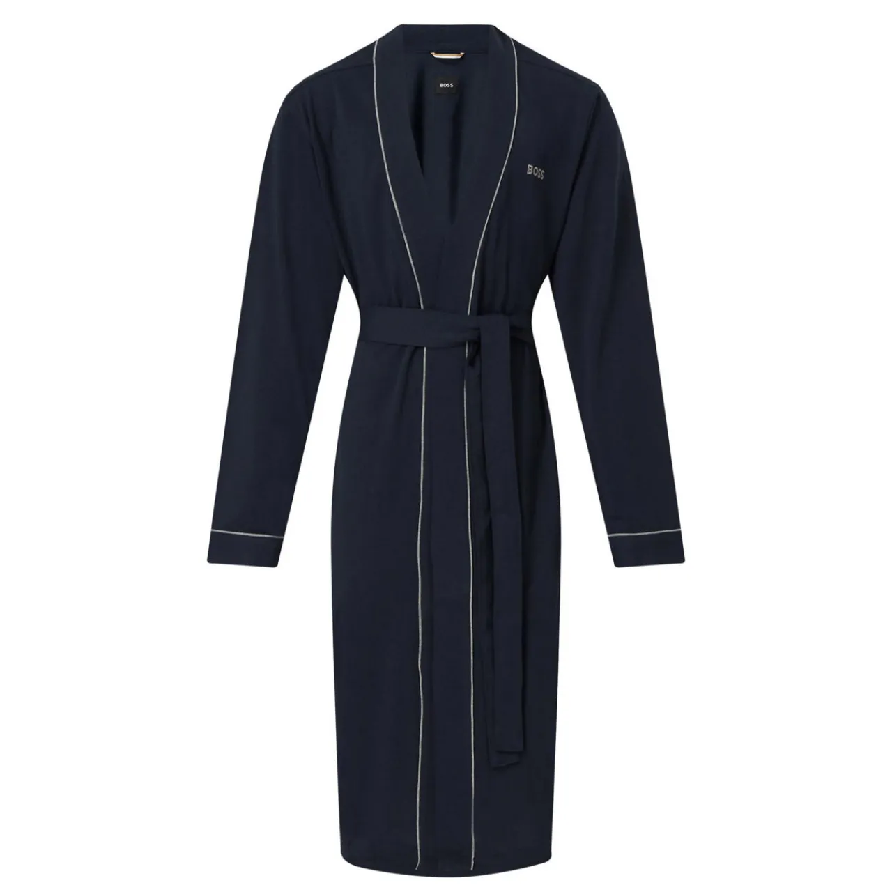 - Long sleeves, kimono collar, wrap-around belt, contrast piping, embroidered logo.