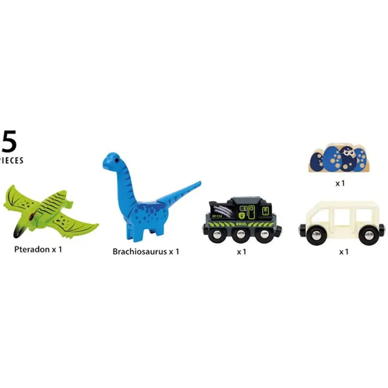 - One battery-powered engine, one wagon, one brachiosauruses figure, one pteranodon figure, one dinosaur eggs cargo