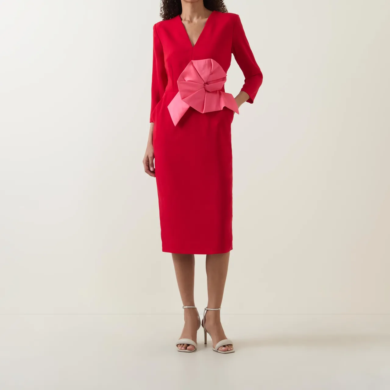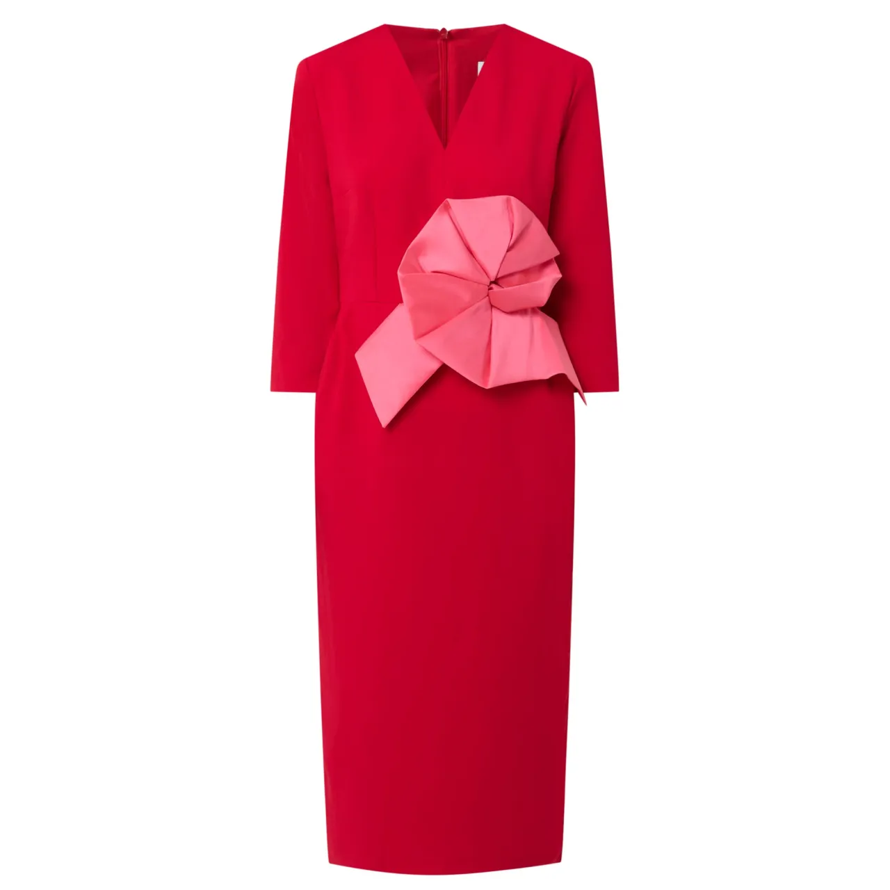 - V-neckline, mid-length sleeves, back zip-fastening closure, oversized flower appliqué to the waist, two side in-seam pockets, pencil silhouette, midi length