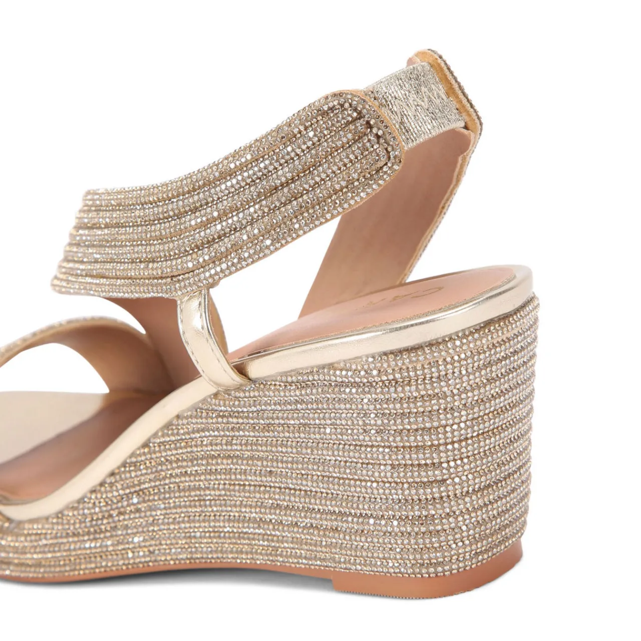 - Wedge-style heel, crystal embellishment, curved strap
