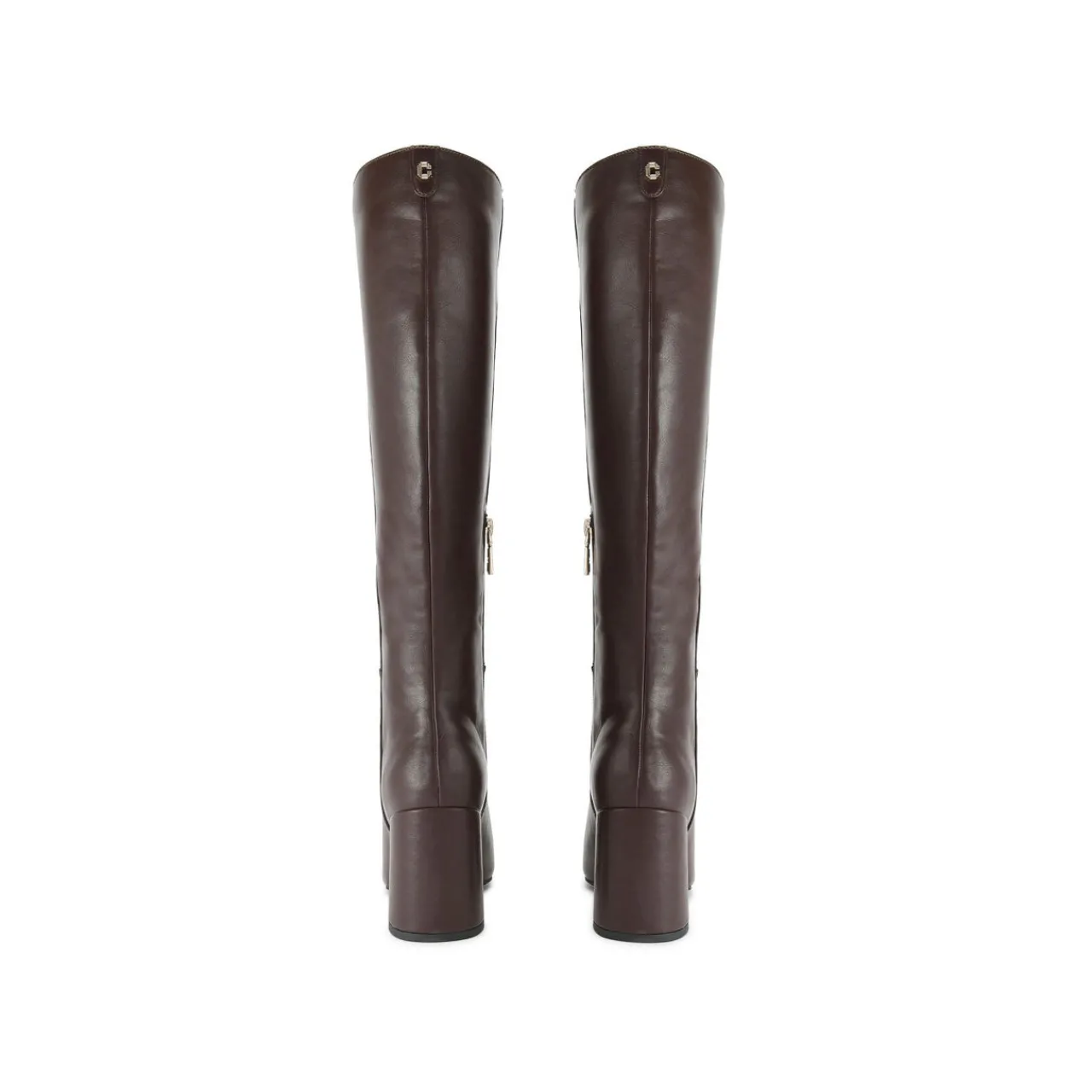 - Knee high length, round toe, block heel, inner side zip, Icon C stud