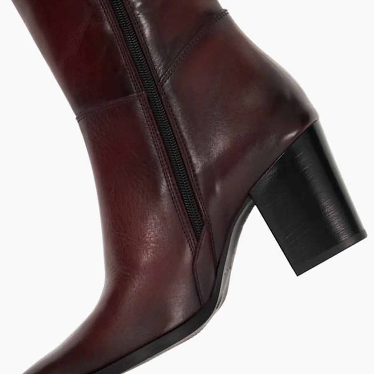 - Knee-high height, block heel, almond-shaped toe, side zip fastening