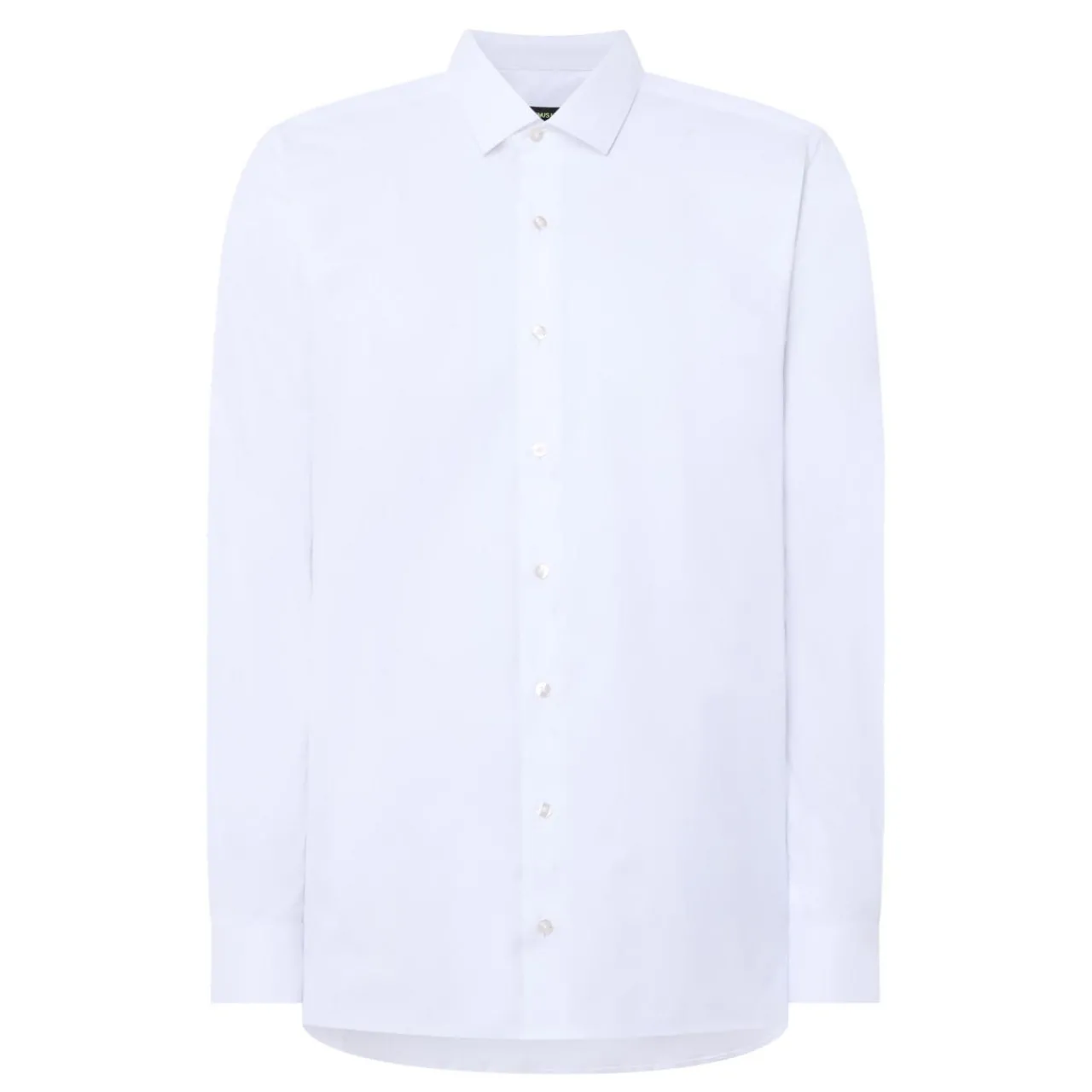 - Cutaway collar, long sleeves, button placket, tonal stitching, single-button cuffs, curved hemline, smooth fabric