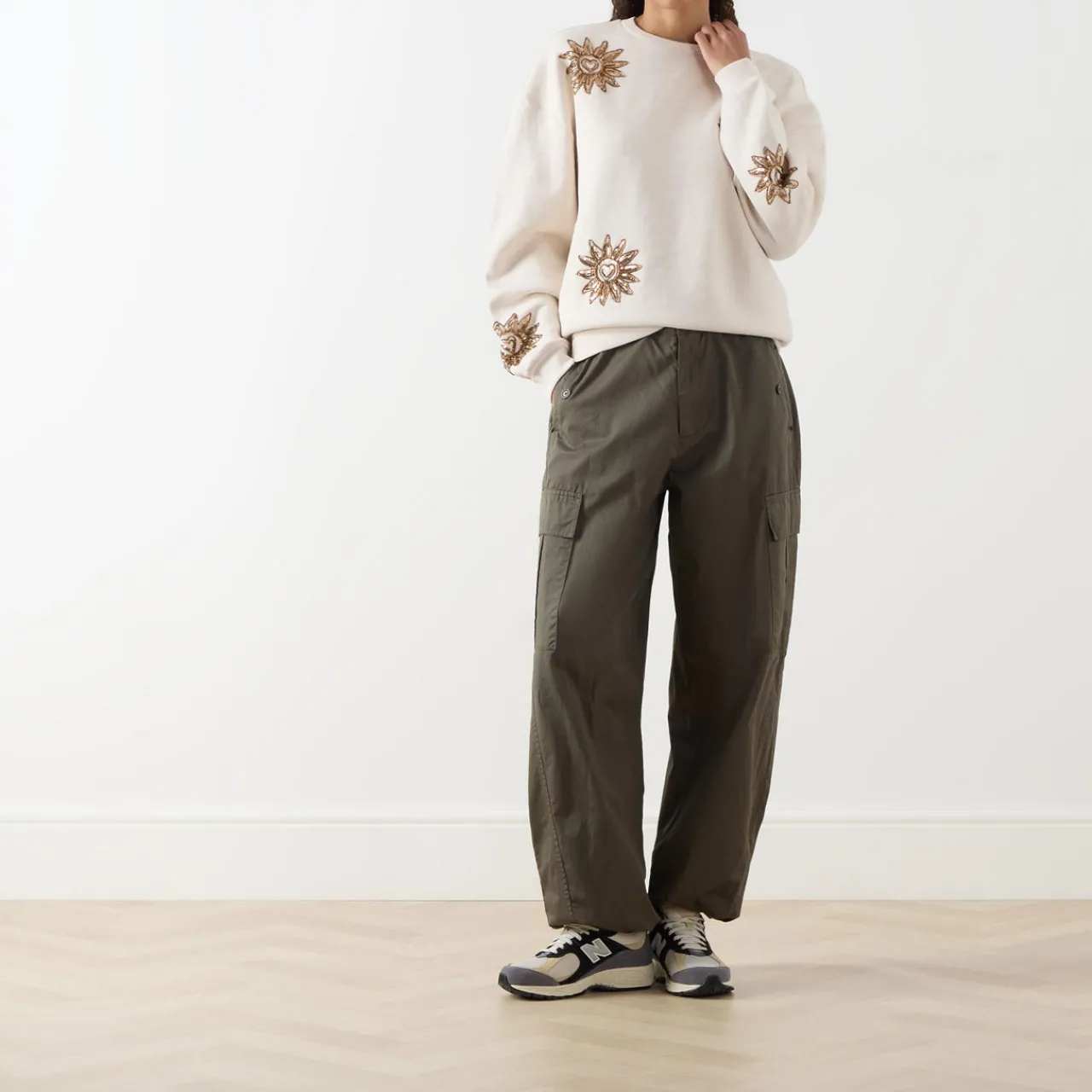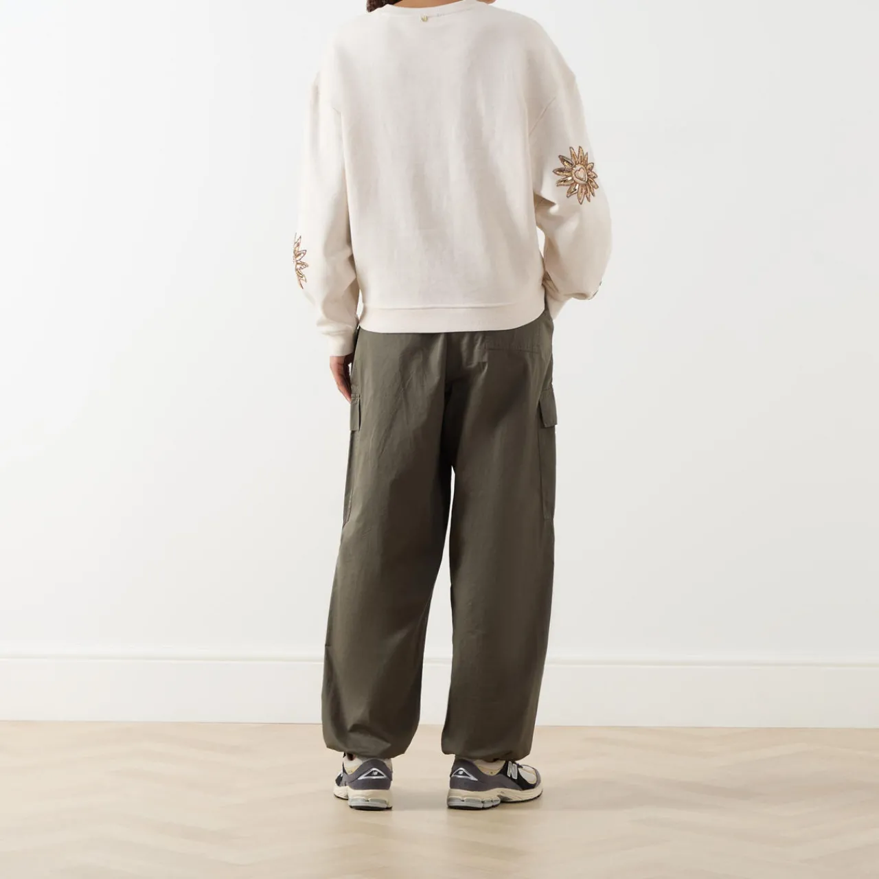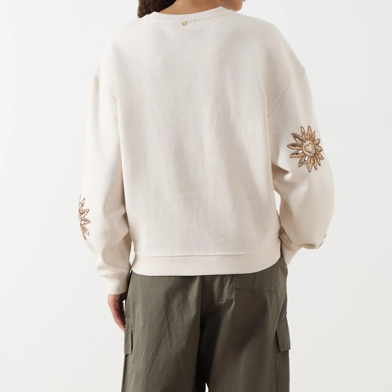 - Crew neck, dropped shoulders, long sleeves, straight hem, ribbed trims, sun embellished detailing throughout, soft finish