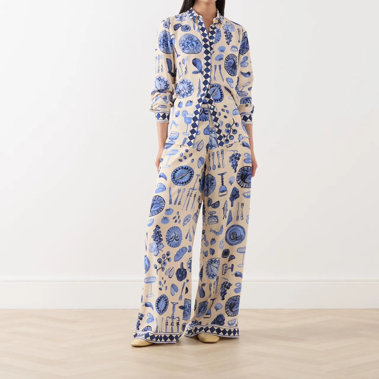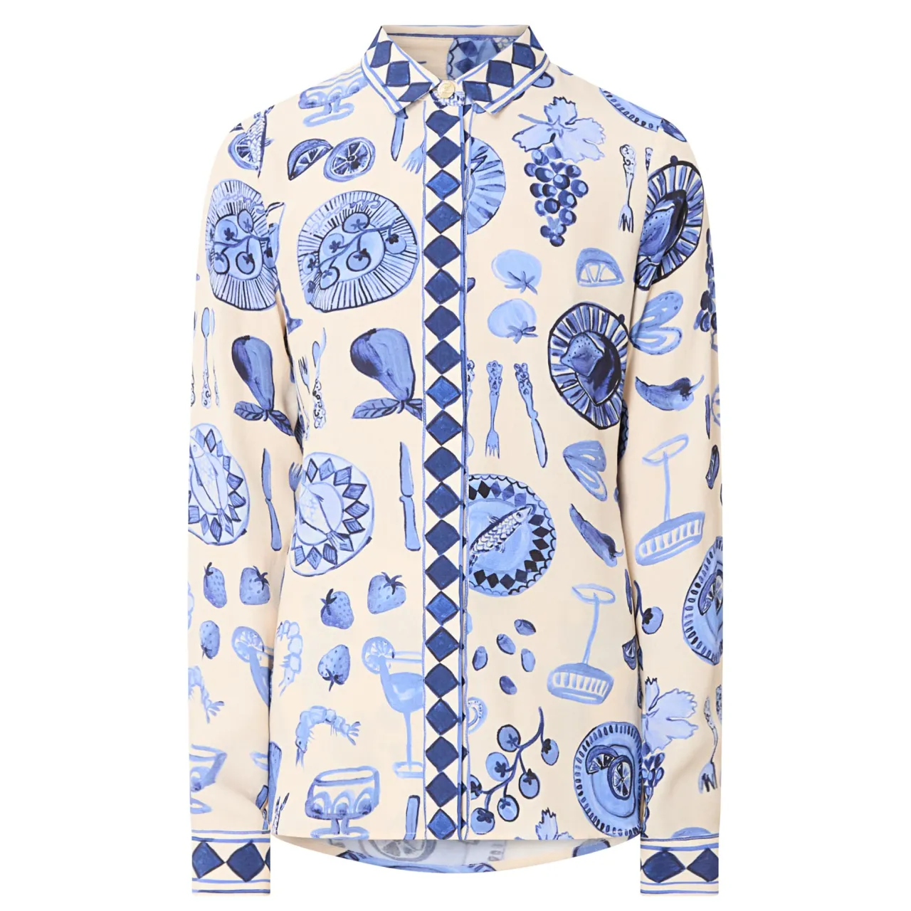 - Pointed collar, long sleeves, printed, concealed button placket, curved hemline