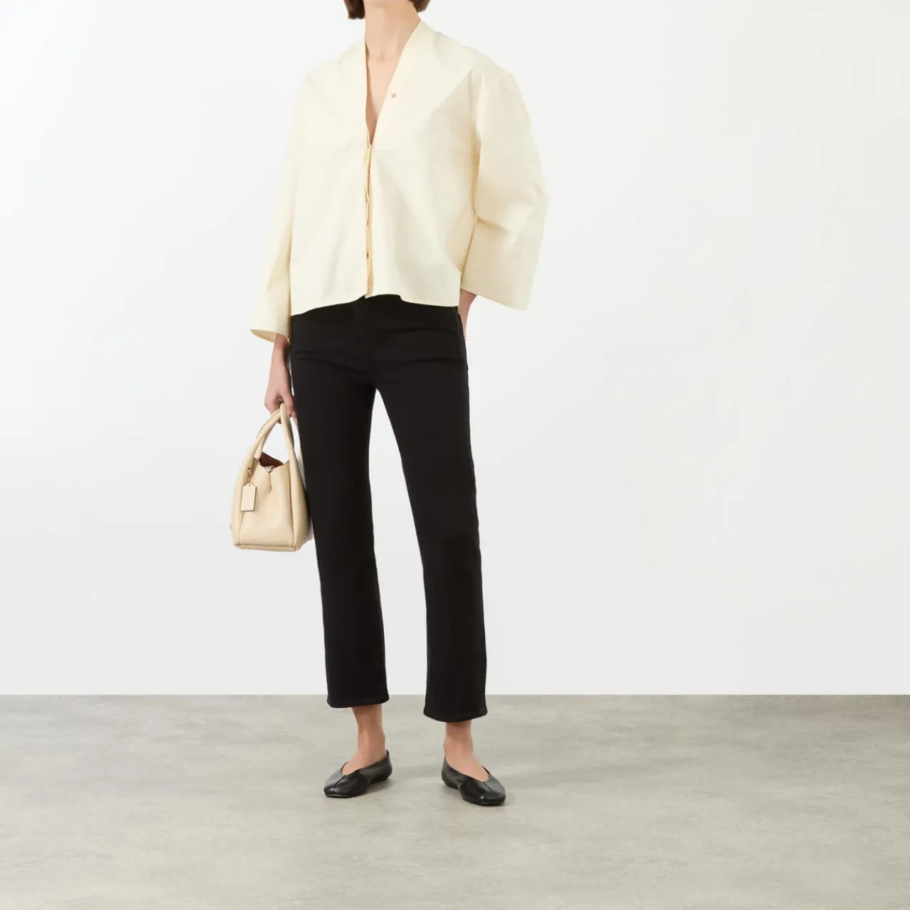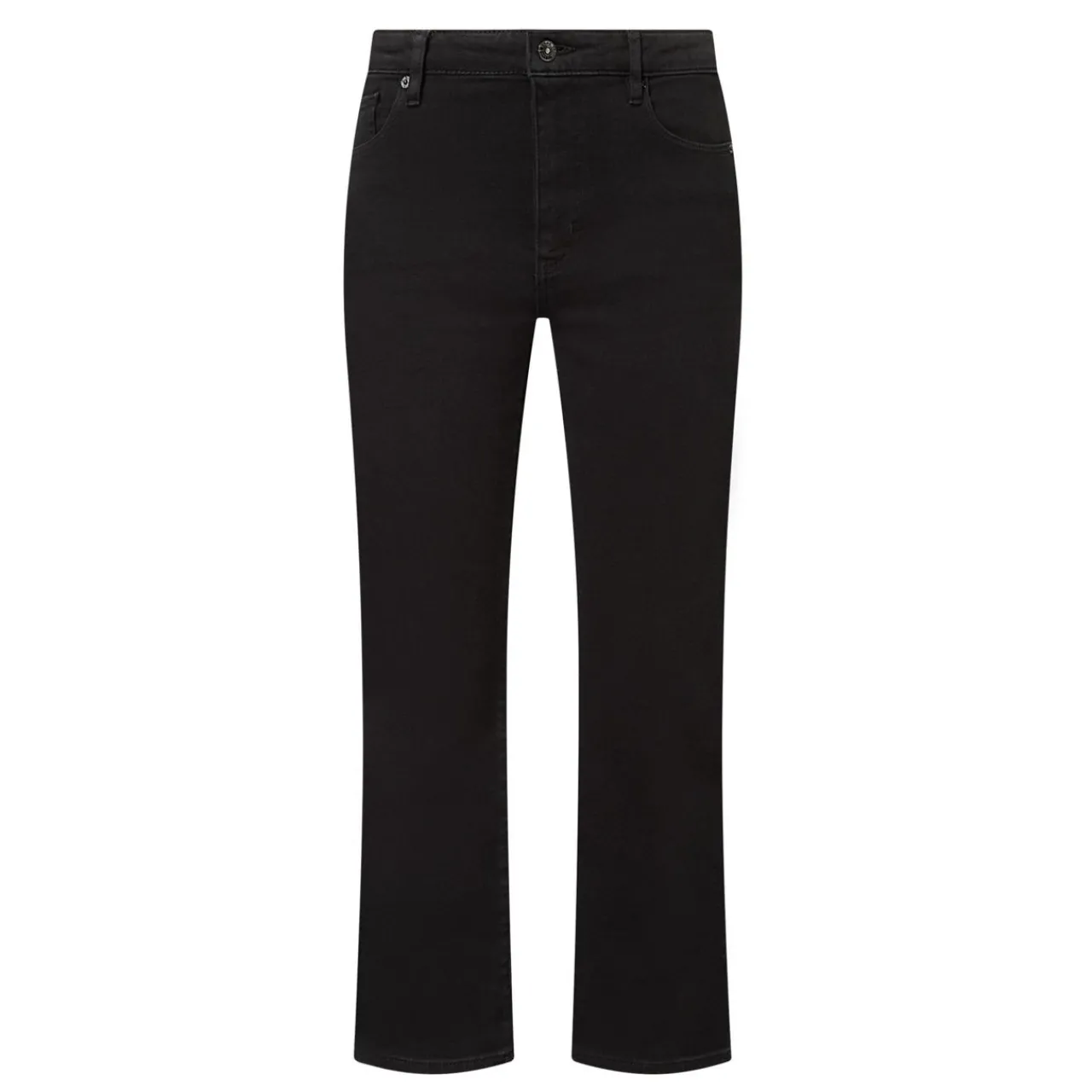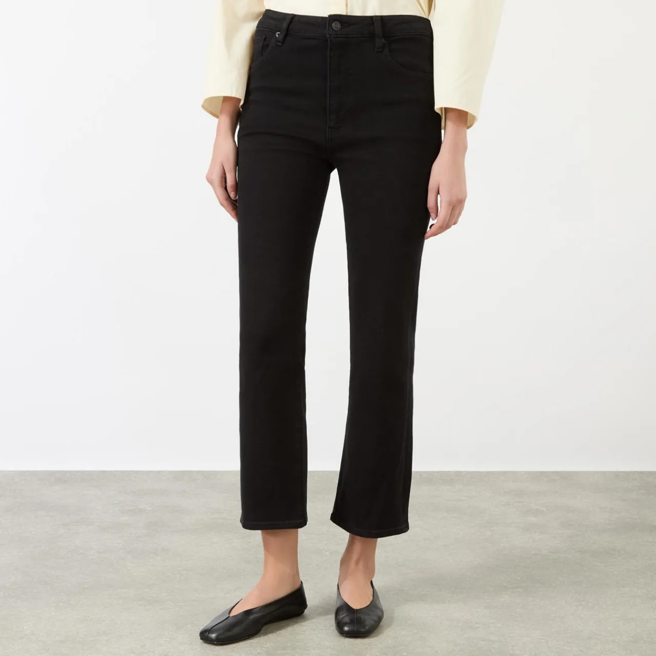 - Cropped length, high-rise, zip and button fly, five pockets, bootleg cut. belt loops