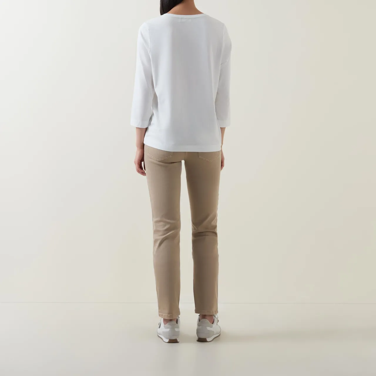 - Mid-length sleeves, round neckline, graphic flower print across the chest, tonal stitching, straight hemline, smooth fabric