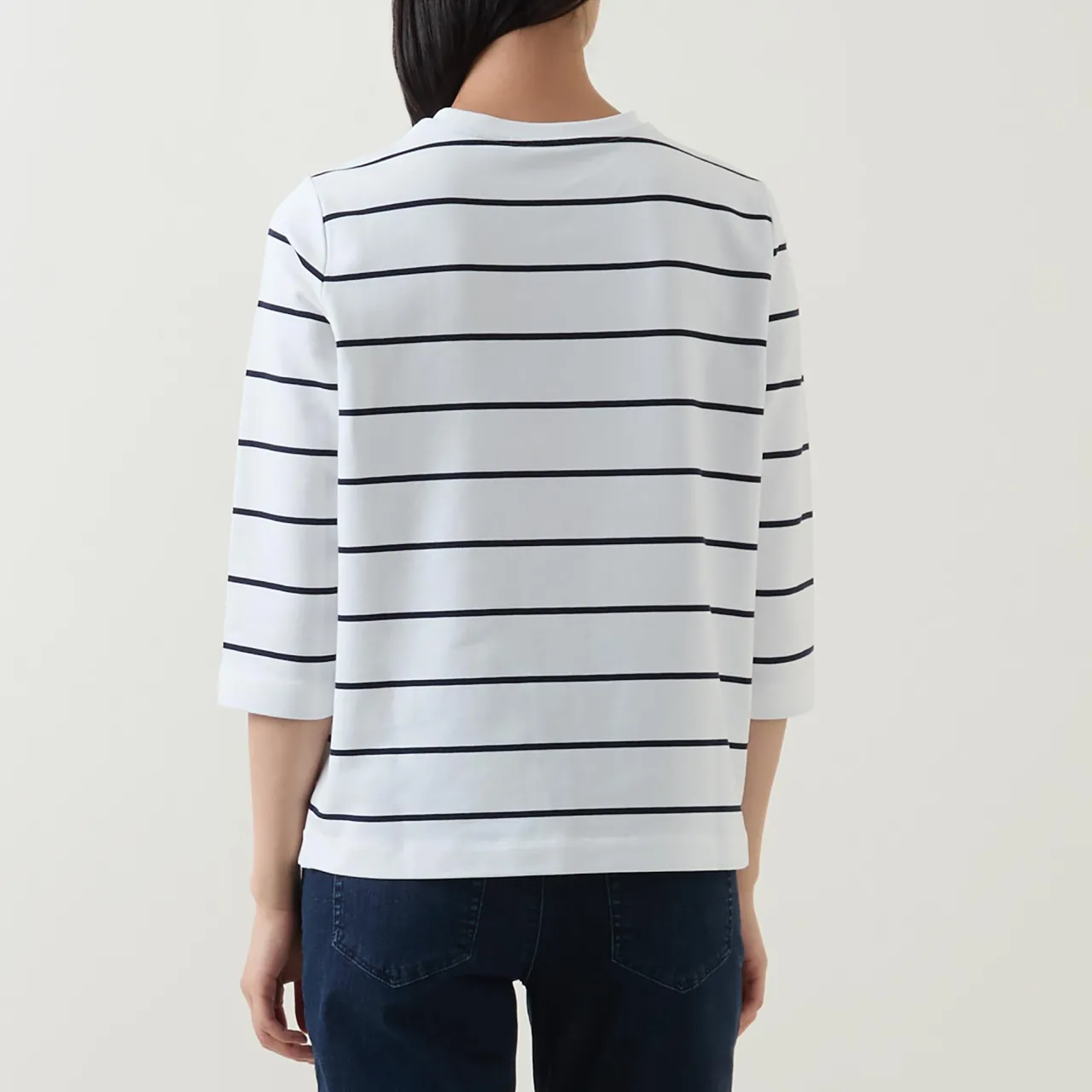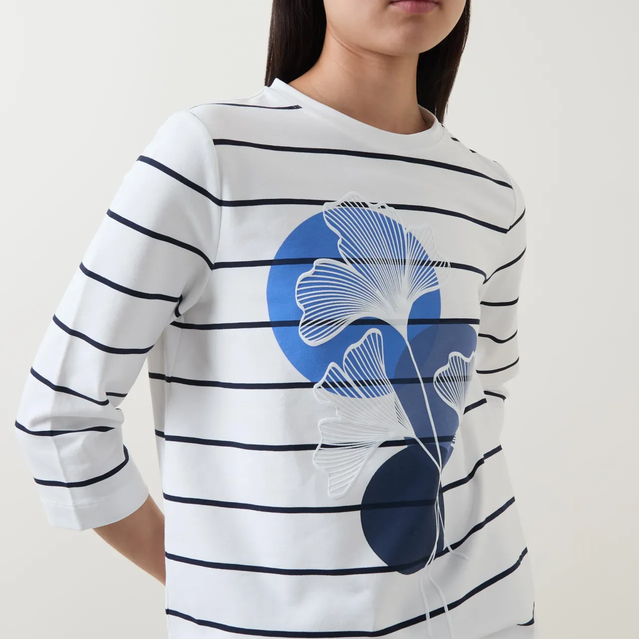 - Mid-length sleeves, crew neckline, graphic flower print across the chest, striped pattern, tonal stitching, straight hemline, smooth fabric