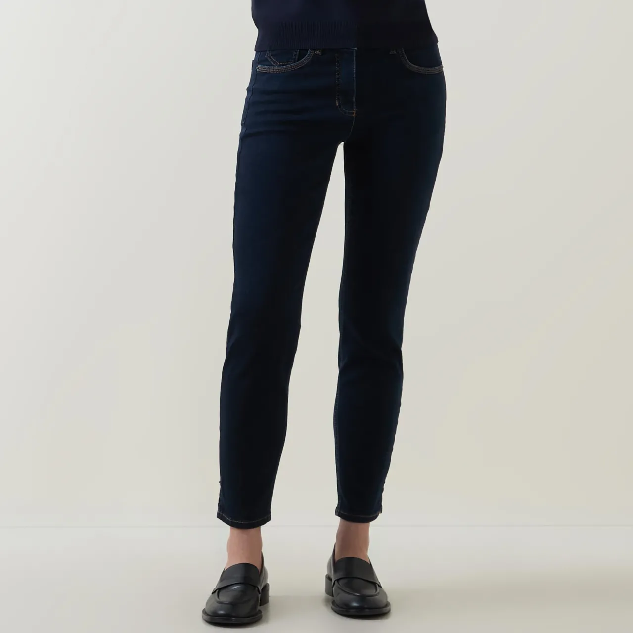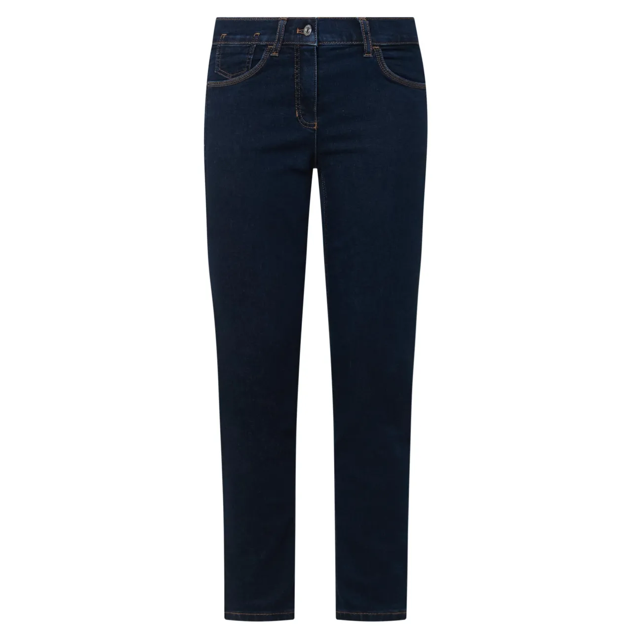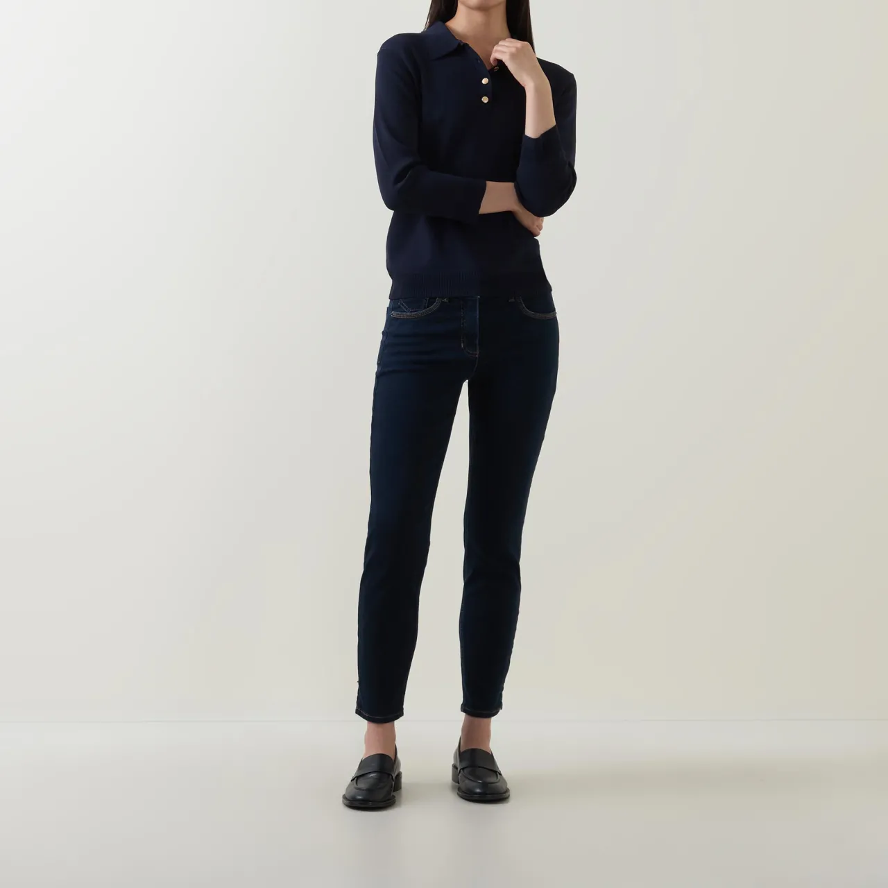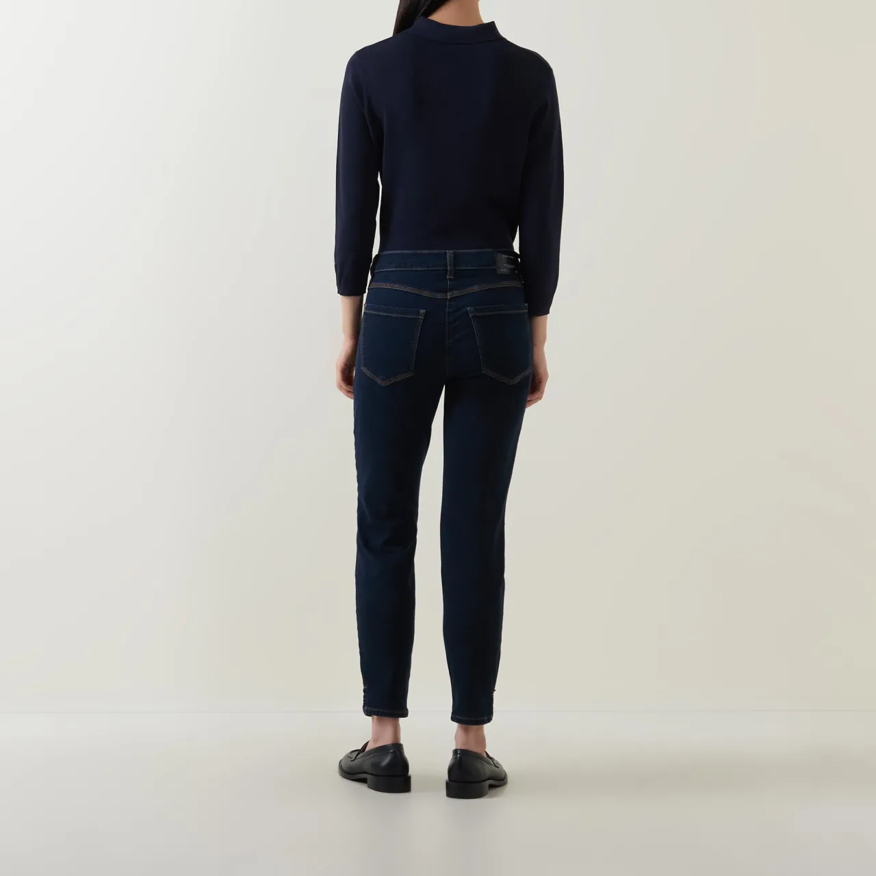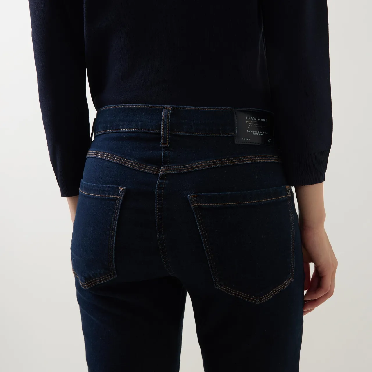 - Zip-fly and button fastening, belt loops, five-pocket design, contrast top stitching, rear logo patch, mid-rise, slim-cut leg, smooth denim finish