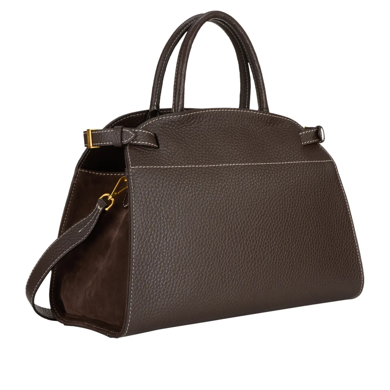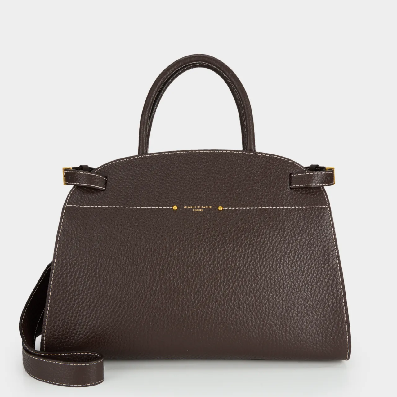 - Top carry handles, magnetic button closure, detachable crossbody strap, buckle and strap detailing, contrast top-stitch embellishment, foil logo print, grained finish, gold-tone hardware