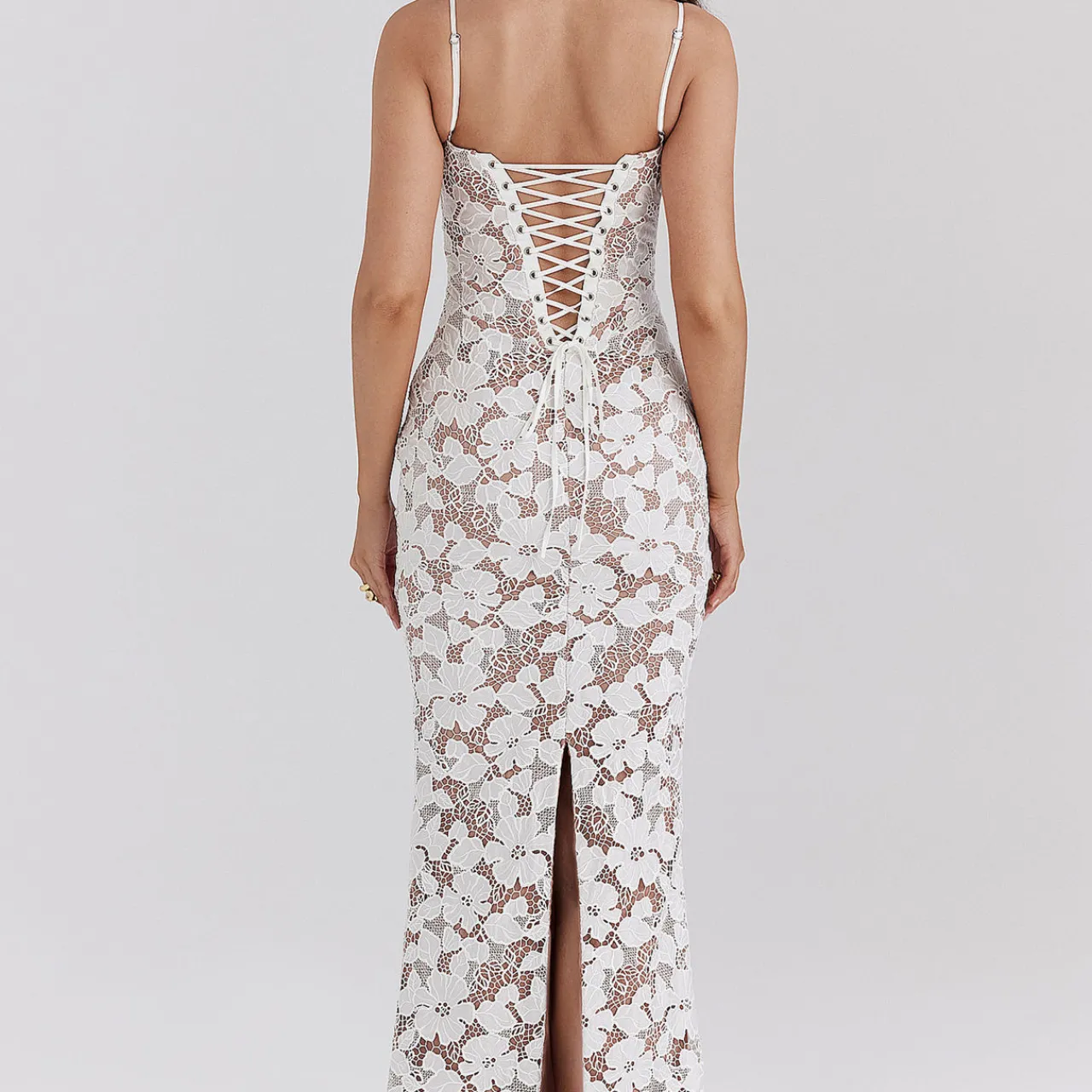 - Maxi length, floral embroidery, lined, supportive underwired cups, lace up back, thin shoulder straps, sweetheart neckline