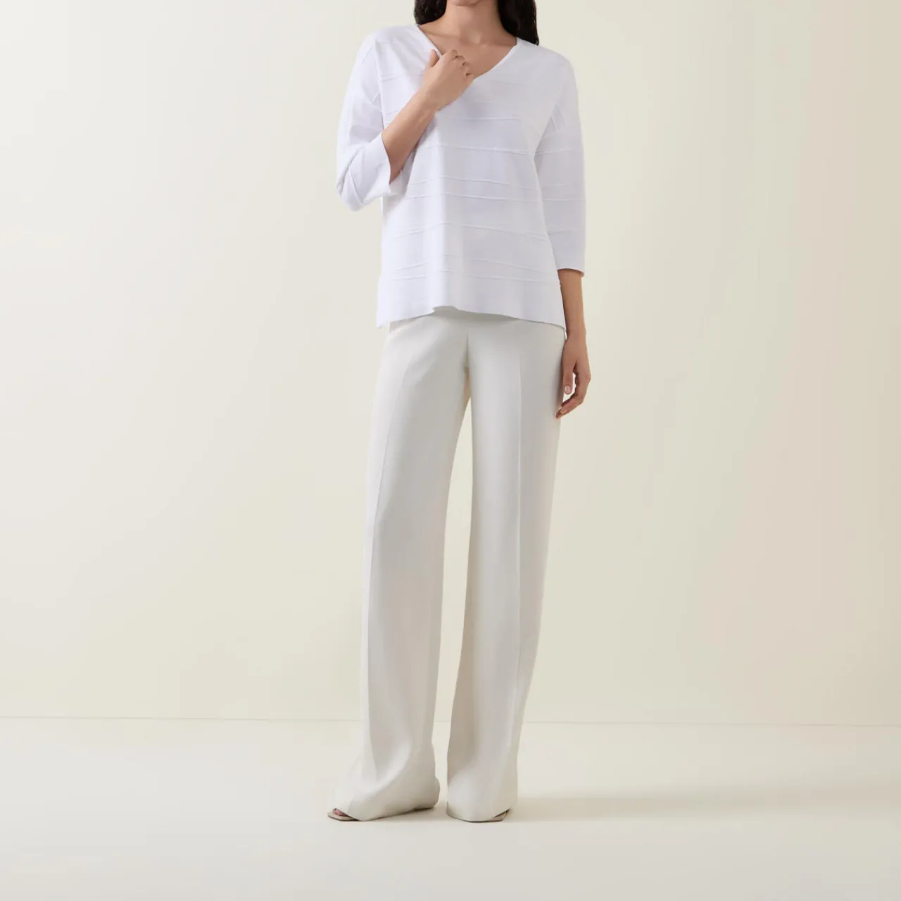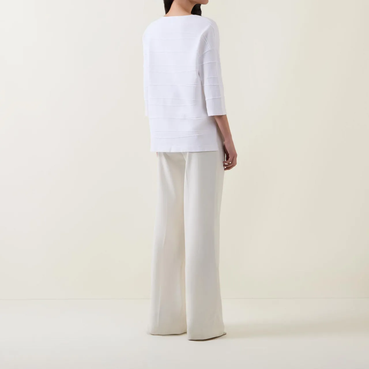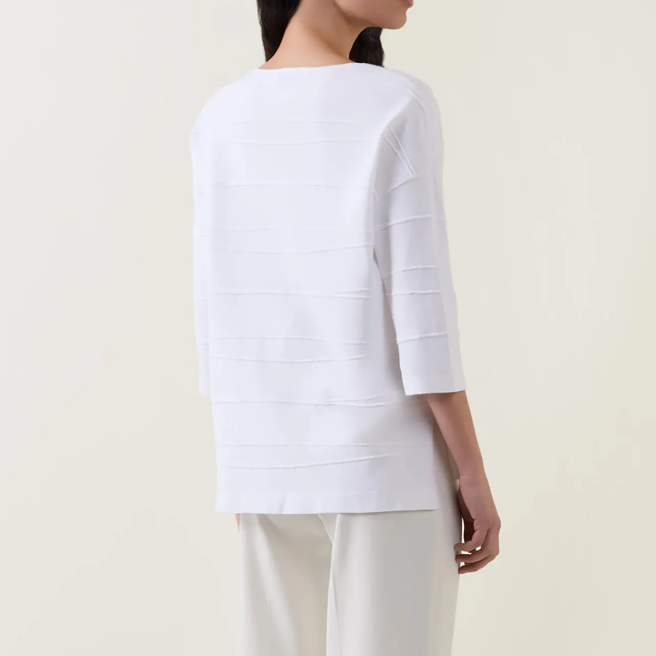 - Jacquard tonal stripe pattern, V-neck, cropped straight sleeves, side slits, knitted