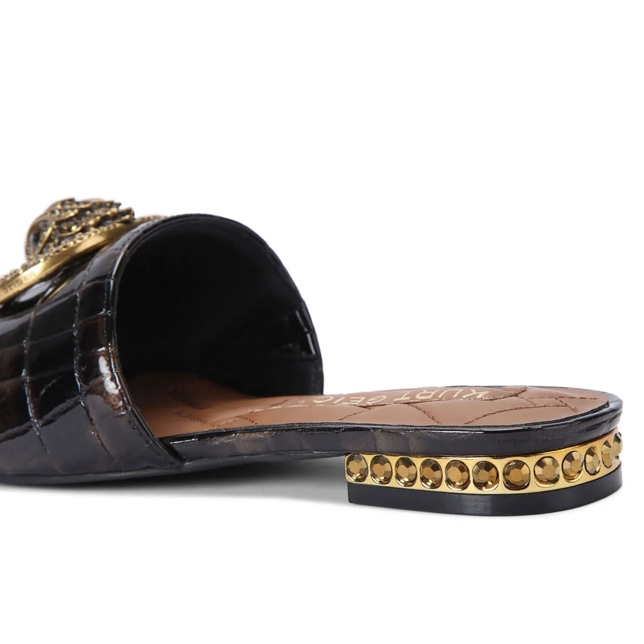 - Open toe, slip on, embellished flat heel, croc-effect finish, embellished eagle head detail