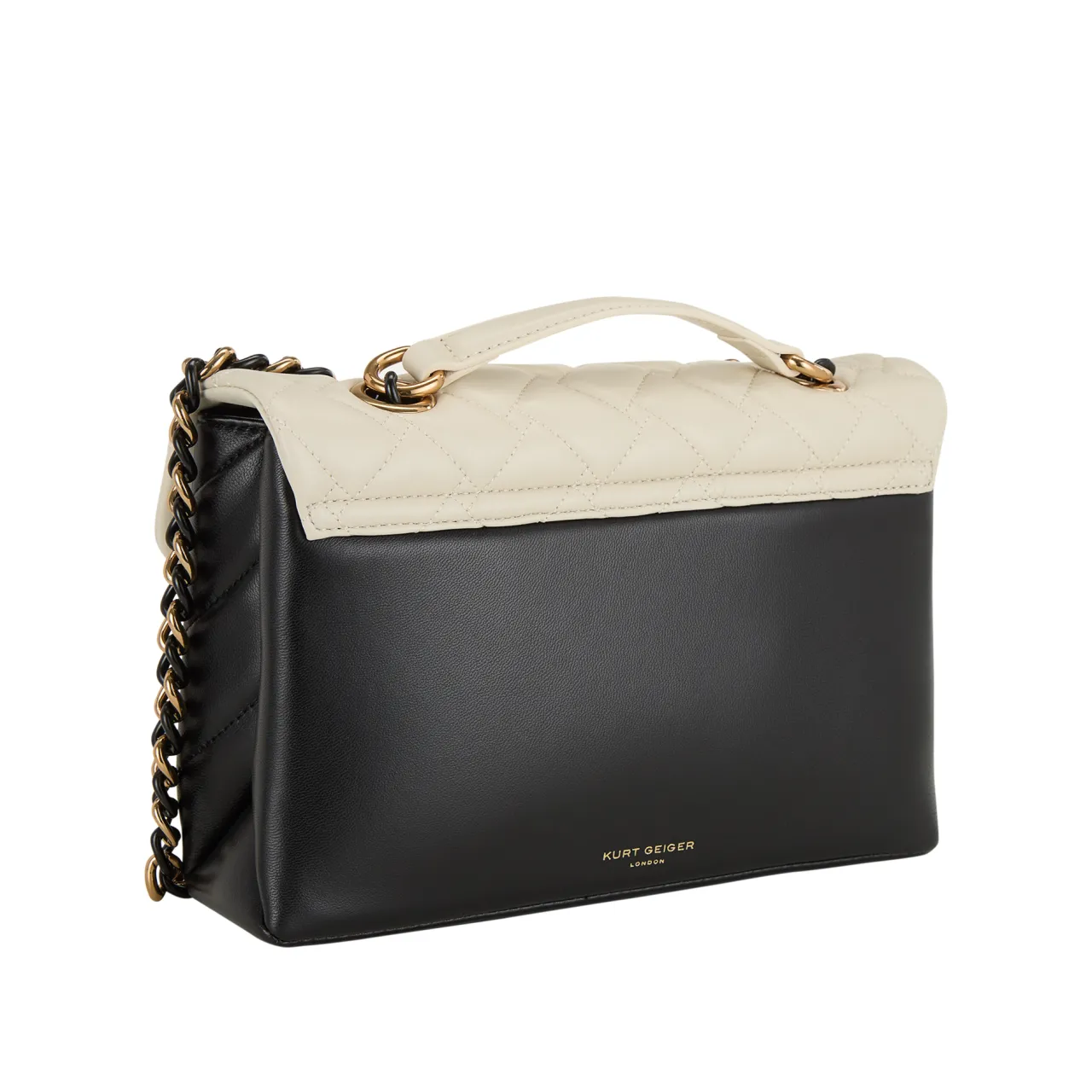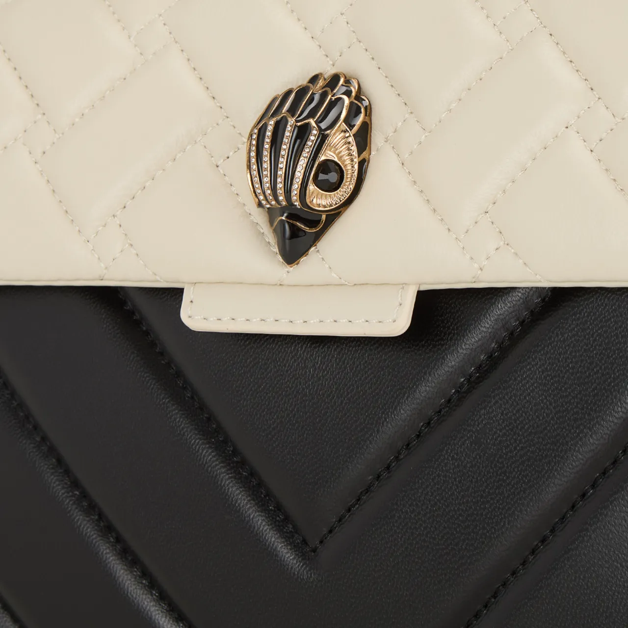 - Flap closure, snap fastening, adjustable chain strap, shoulder guards, eagle head hardware, chevron quilted design, two-tone design, logo lettering, gold-tone finishes
