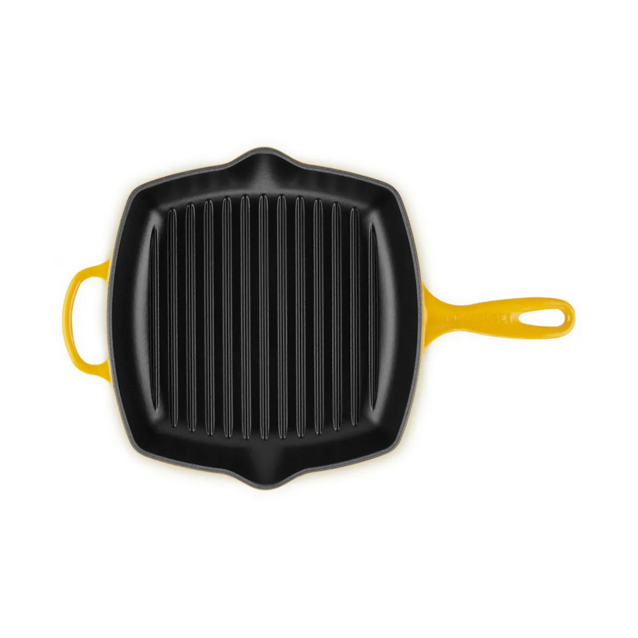 - The grill is coated with Le Creuset’s specialist satin black enamel finish. Durable and easy to clean, the satin black enamel interior has been especially designed to protect the pan (no seasoning is required) and is ideal for searing and grilling foods such as meat, fish and vegetables. Only low to medium heat is required when cooking and will achieve the high surface heat required for searing