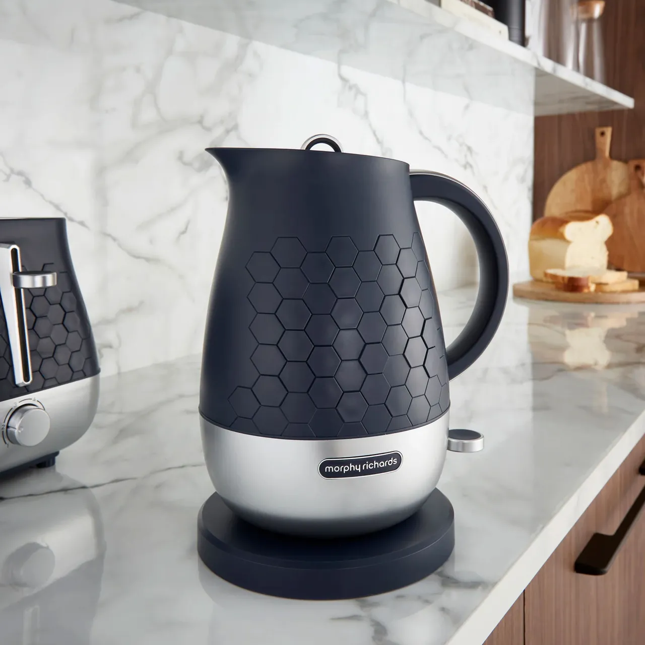 Discover the Morphy Richards Cassini 1.7L Jug Kettle! Boasting a sleek design with efficient functionality, this modern kettle delivers a standout choice for any kitchen. The Cassini range features a distinctive hexagonal design across the kettle, toaster, and microwave, creating a cohesive and modern aesthetic for your kitchen. The jug kettle offers a generous 1.7L capacity and powerful 3kW rapid boil element meaning this electric kettle quickly heats water for multiple cups, saving you time. The carefully designed spout ensures a smooth, splash-free pour every time, while the 360-degree base allows you to place the kettle back onto the base from any angle, perfect for left- or right-handed users!
