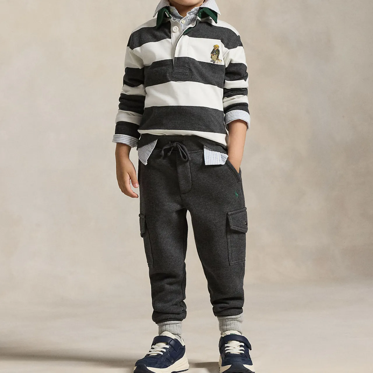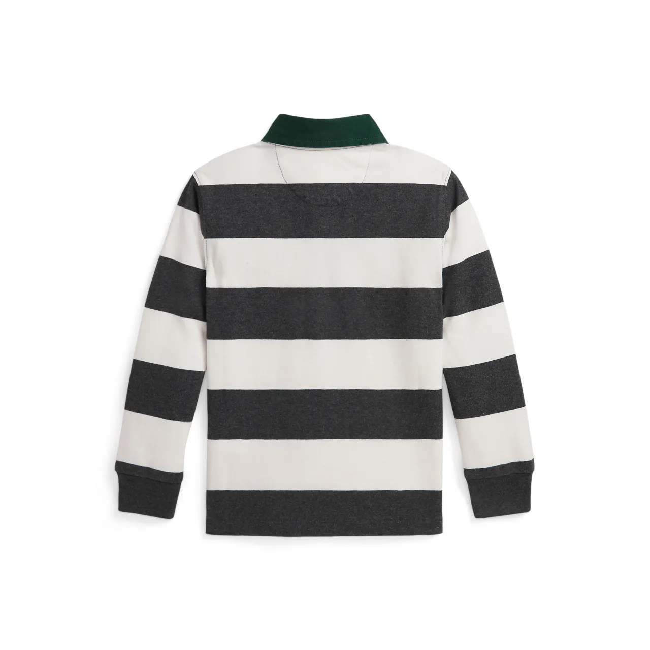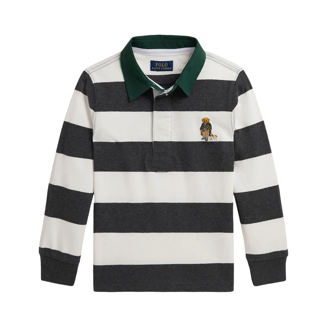 - Twill rugby collar, three-button rugby placket, rubber-finished button, long sleeves with ribbed cuffs, polo Bear, bulldog, and logo embroidered at the left chest