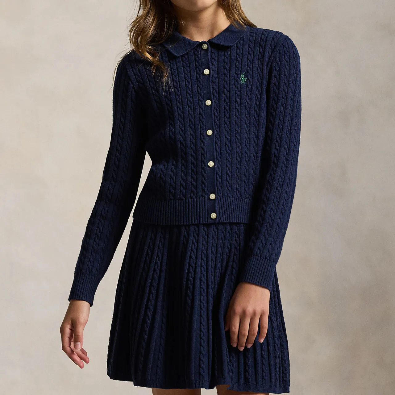- Cardigan: Signature embroidered Pony logo, mini-cable knitted pattern, rib-knit Polo collar, buttoned placket, long sleeves, rib-knit cuffs, rib-knit hem. Skirt: Rib-knit waistband, rib-knit hem, mini-cable knitted pattern, mini length