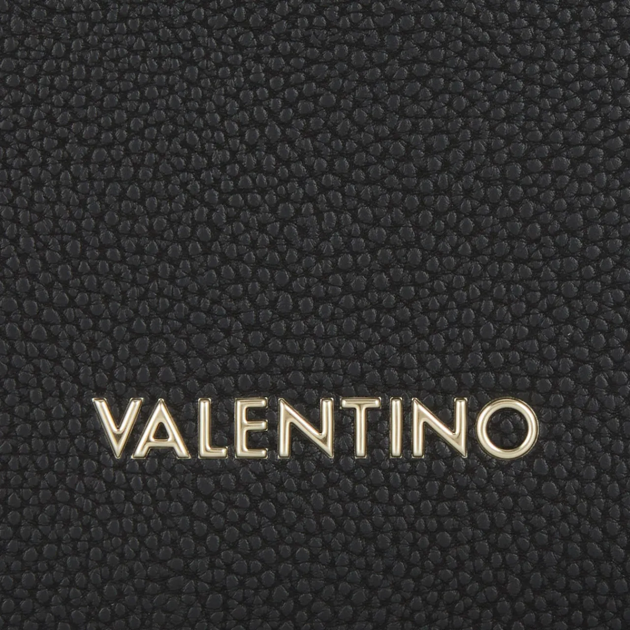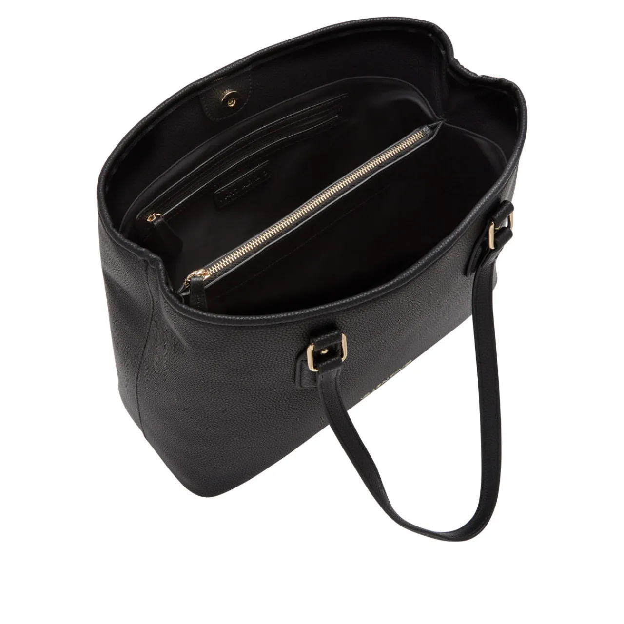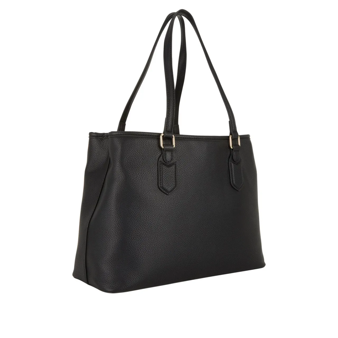 - Top handles, magnetic snap-fastening, two main compartments separated by a third compartment with zip fastening, one interior pocket with zip fastening, logo lettering across the front, gold-tone hardware, grained finish