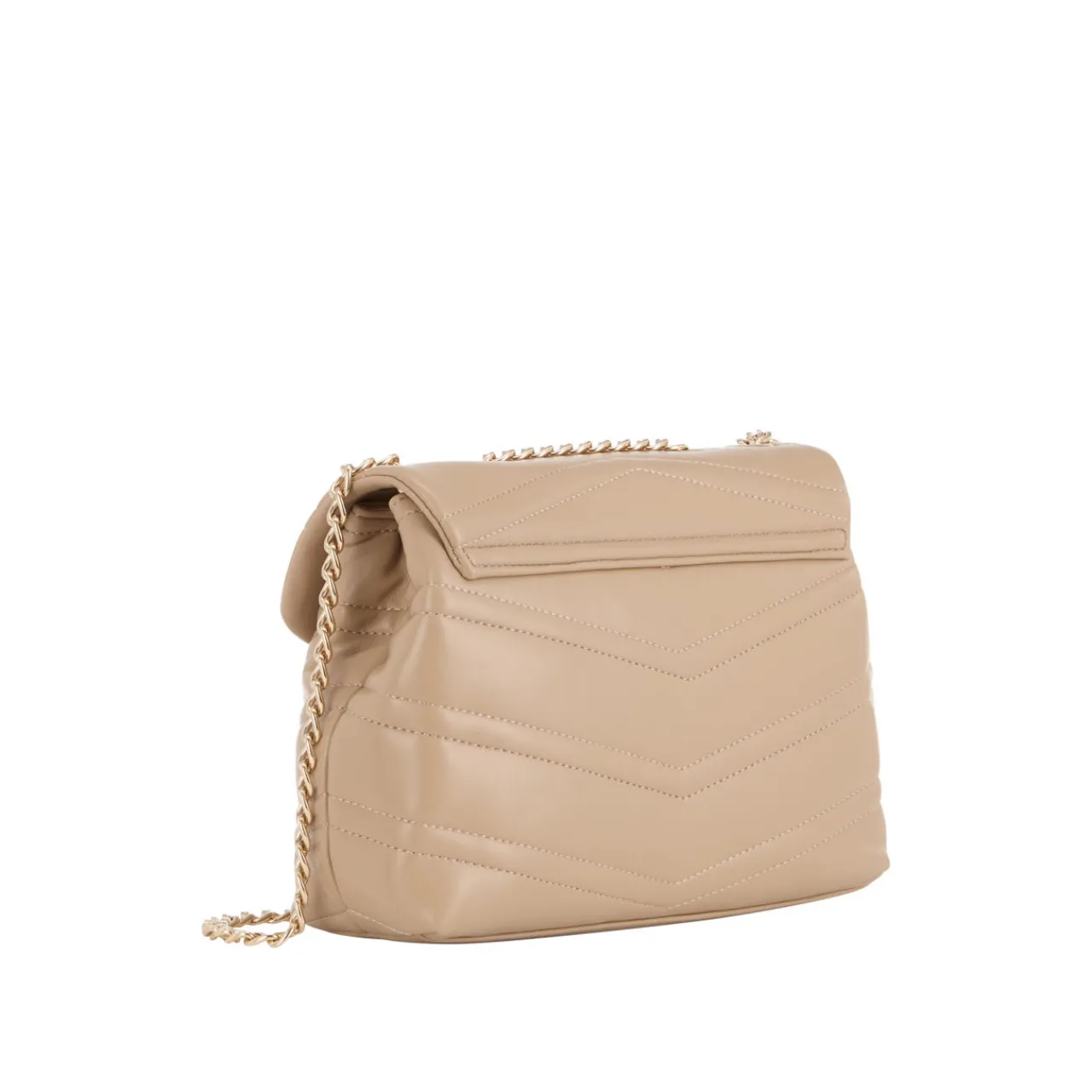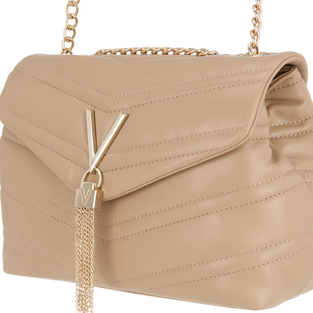 - Chain straps, flap closure, V-logo detail with gold-tone metal tassel, chevron stitching details