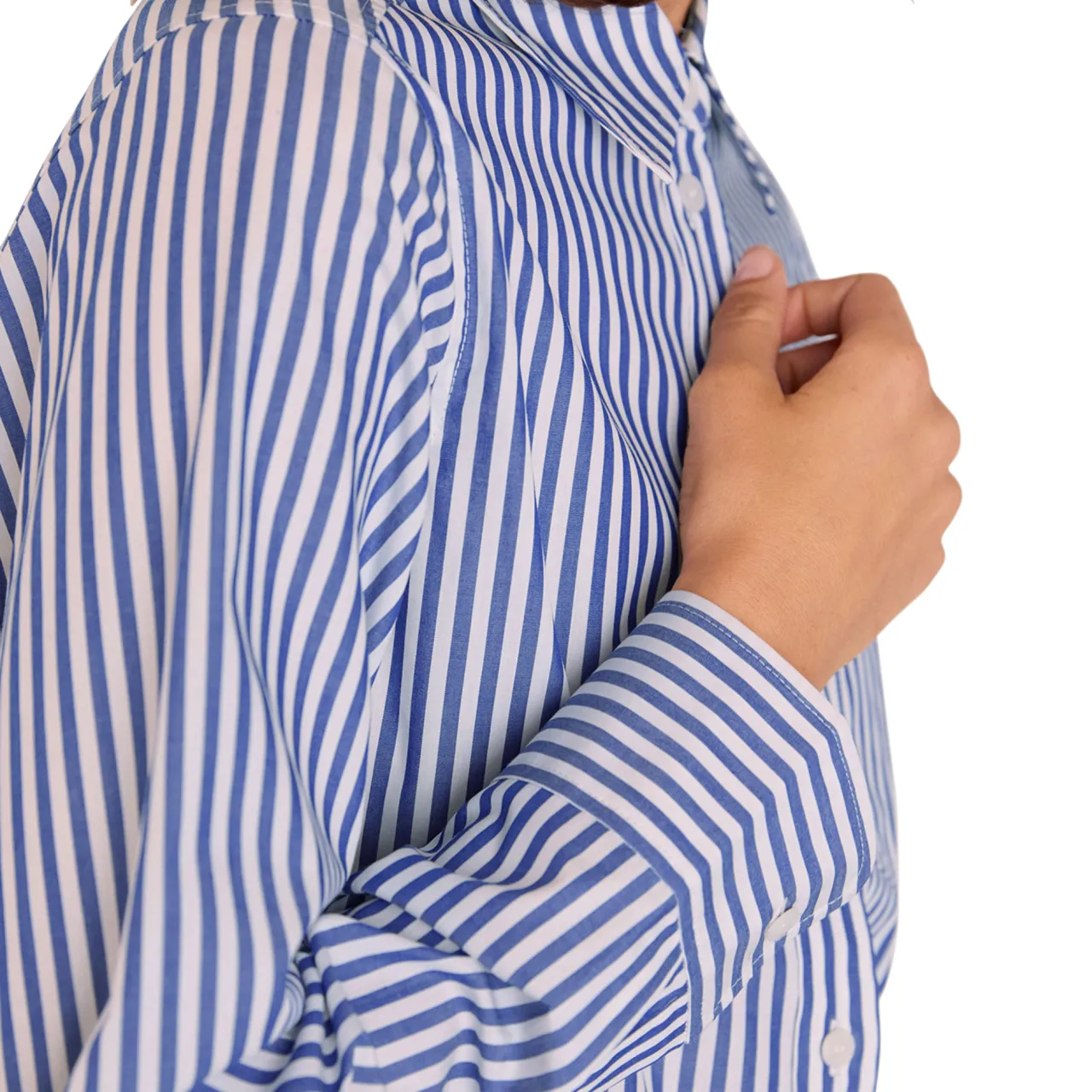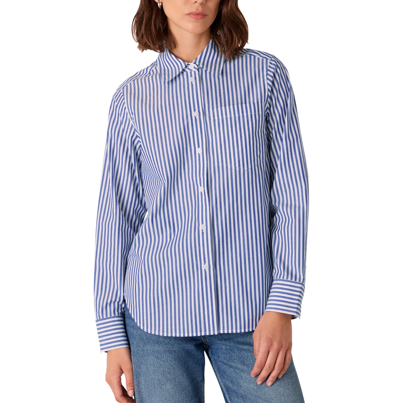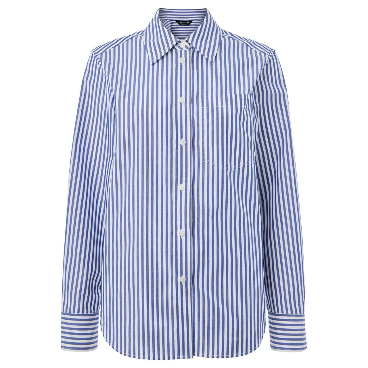 - Stripes, chest pocket, buttons, cuff buttons, collared neckline