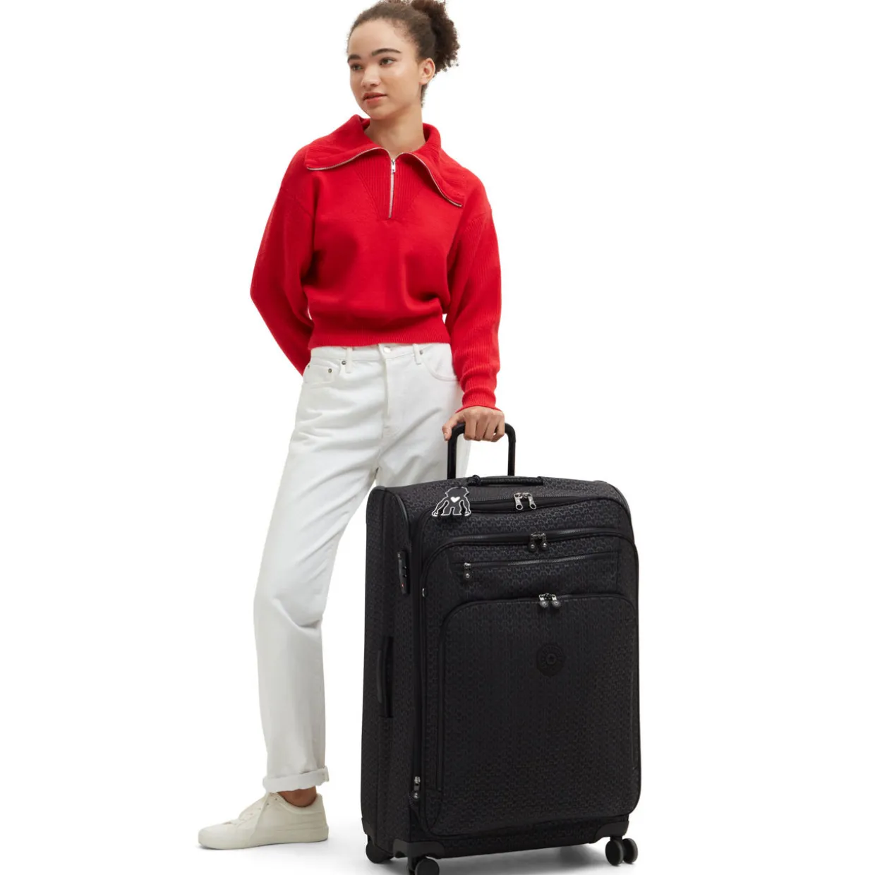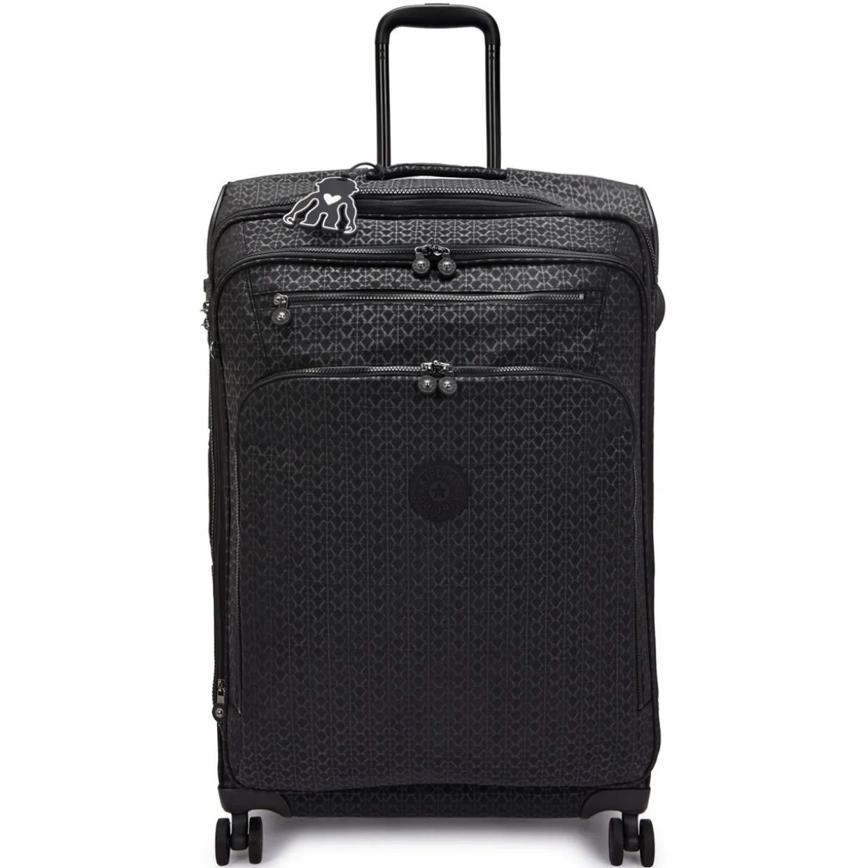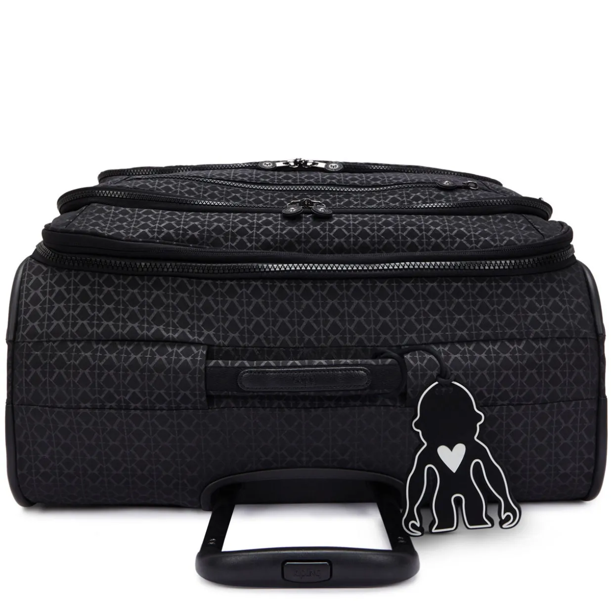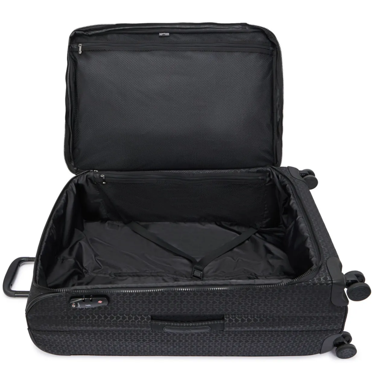 - Features:Four 360 spinner wheels, extendable trolley handle, carry handles, logo badge, water repellent, expandable, packing straps, silicone name tag, three front zipped pockets, integrated double TSA lock, printed design. Interior: One main compartment, two zipped pockets