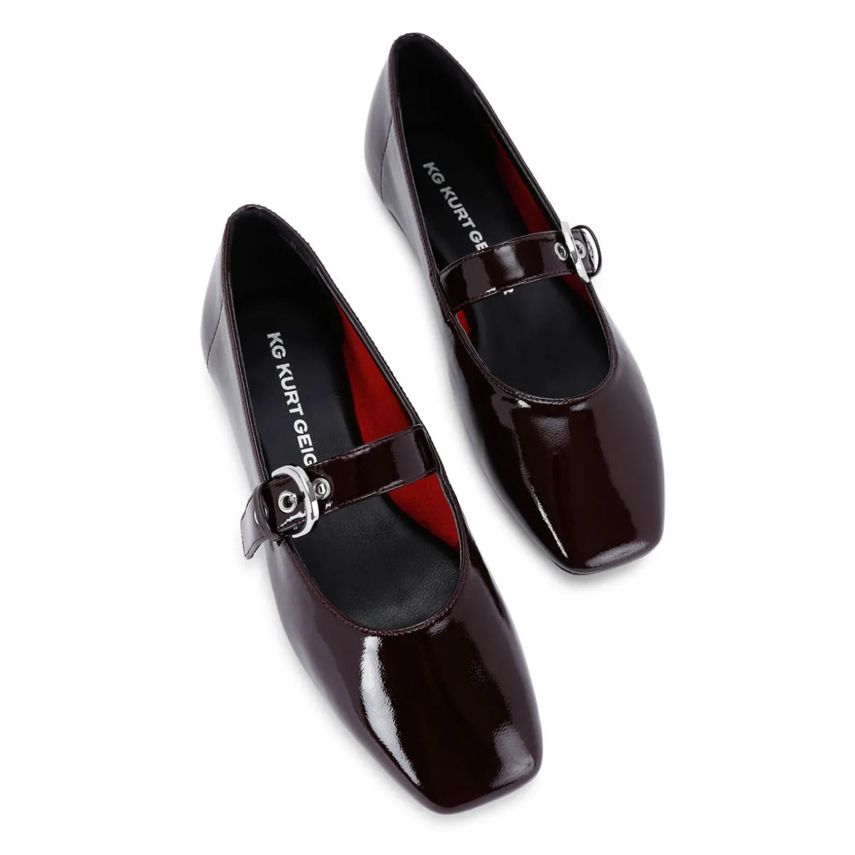 - Slip-on style, strap across the foot with buckle fastening, round toe, patent finish