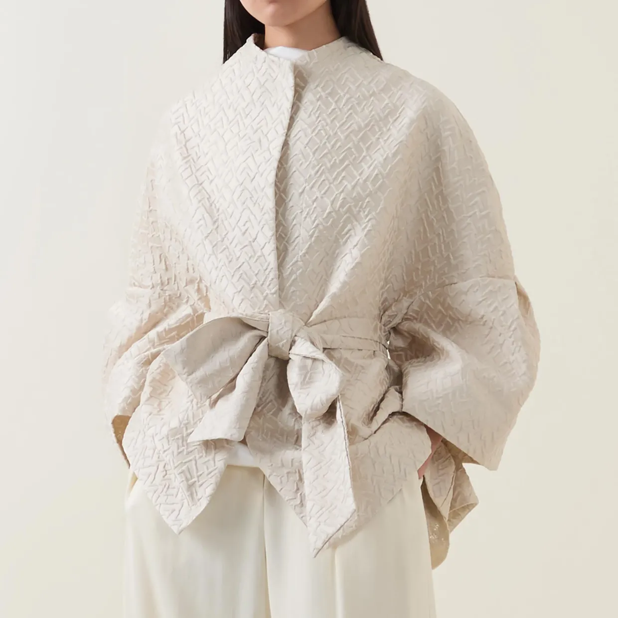 - High neckline, rounded shoulders, long cocoon sleeves, pleated detailing, concealed front fastening, matching belt closure, curved hem, textured finish