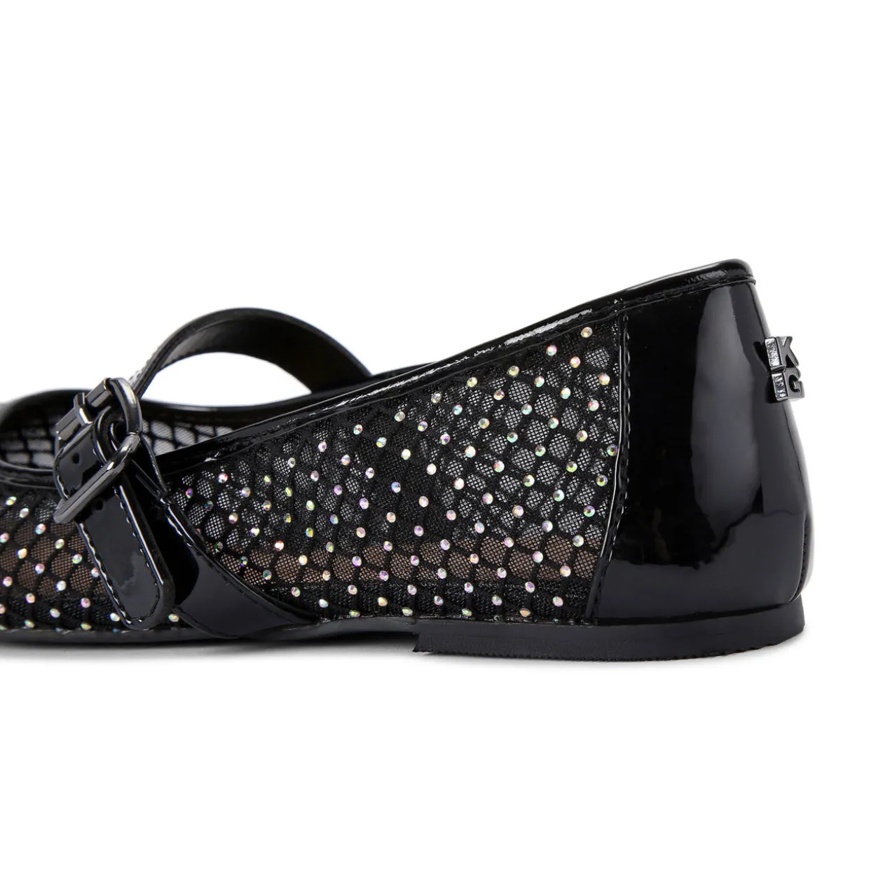 - Mesh upper, iridescent crystal embellishment, patent foot strap, buckle fastening, patent heel panel, silver-tone brand heel stud, squared toe