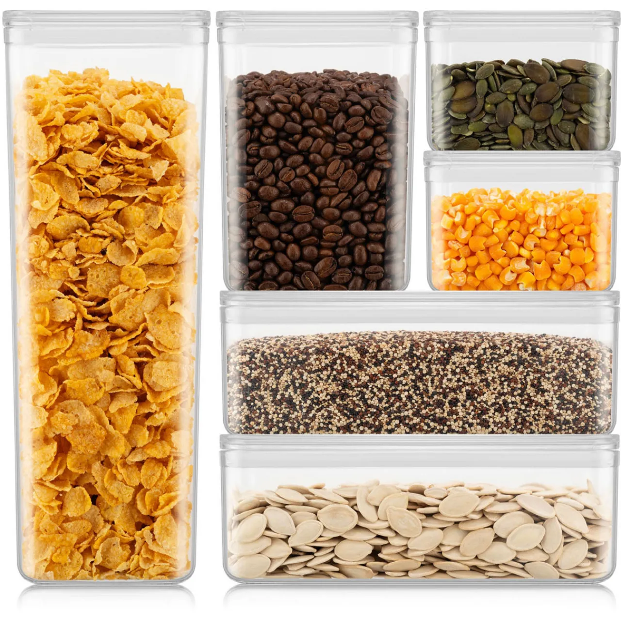 - Set of 6 storage jars, made of BPA-free plastic, safely stores a variety of foodstuffs, lid to keep food fresh