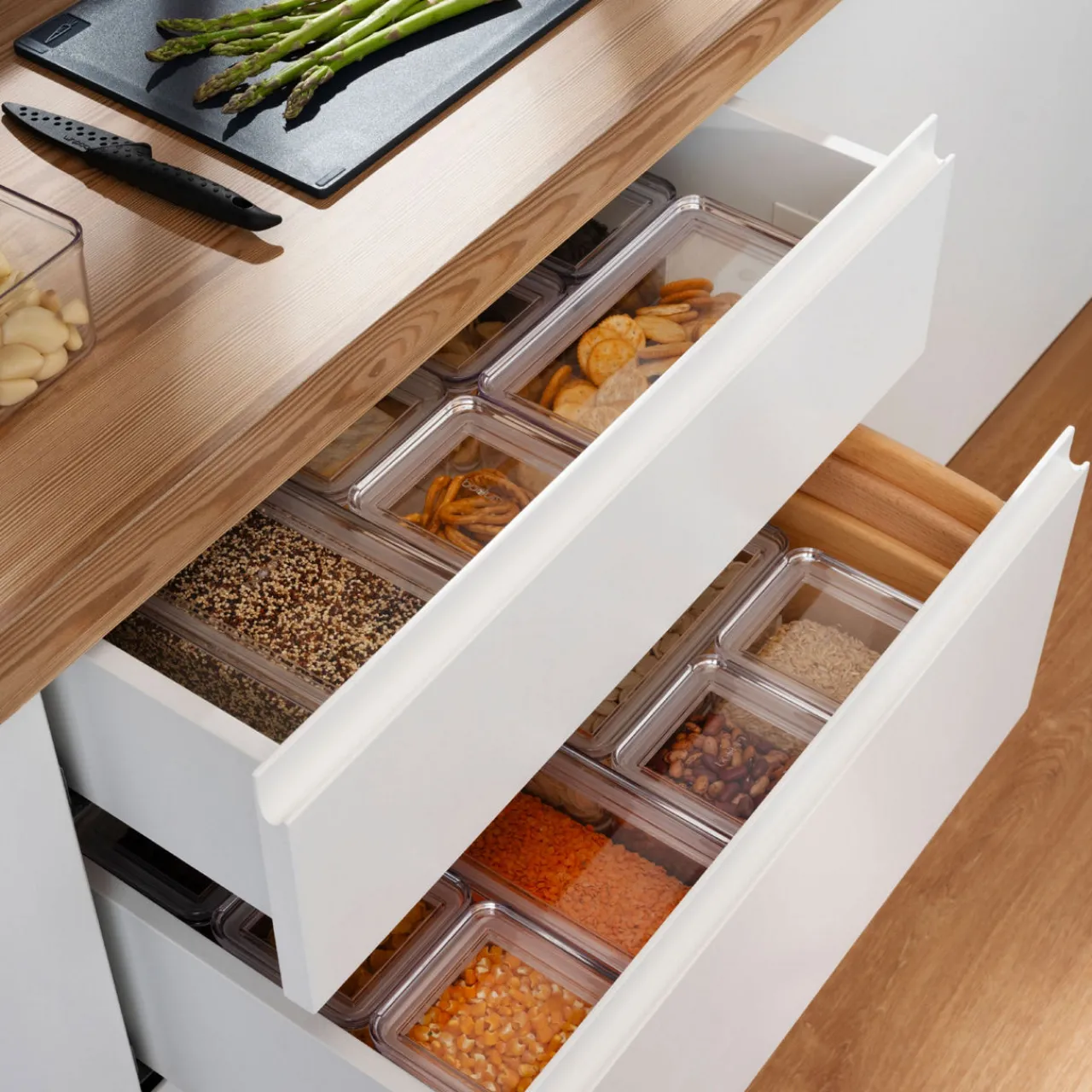 - Capacity: 2 x 1L, 1 x 1.2L, 2 x 0.5L, 1 x 2.6L
