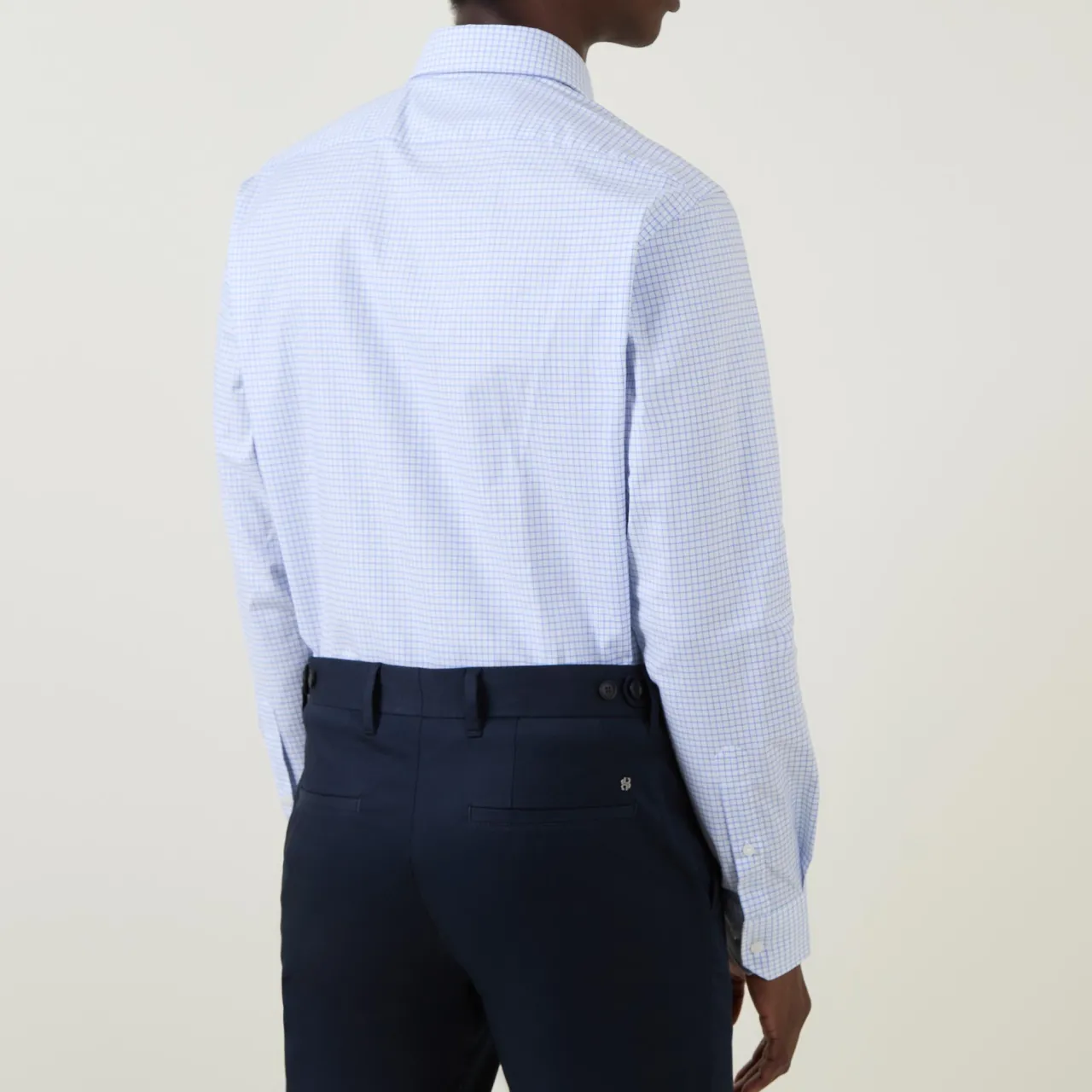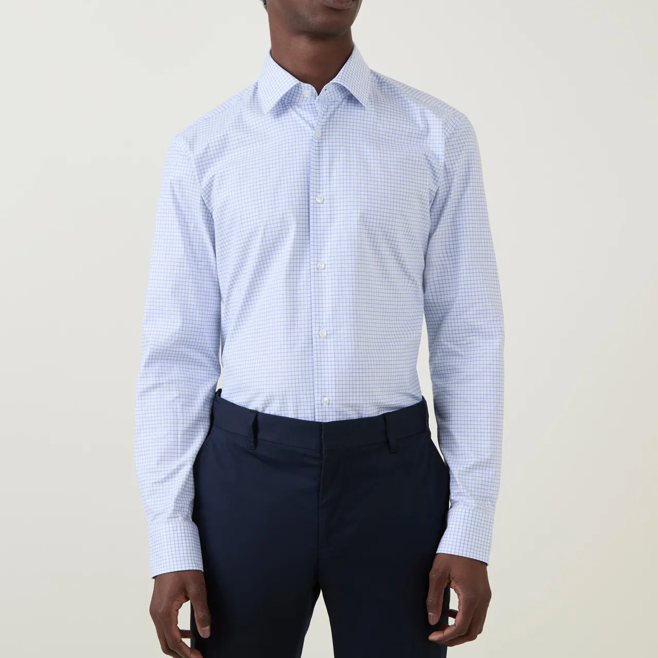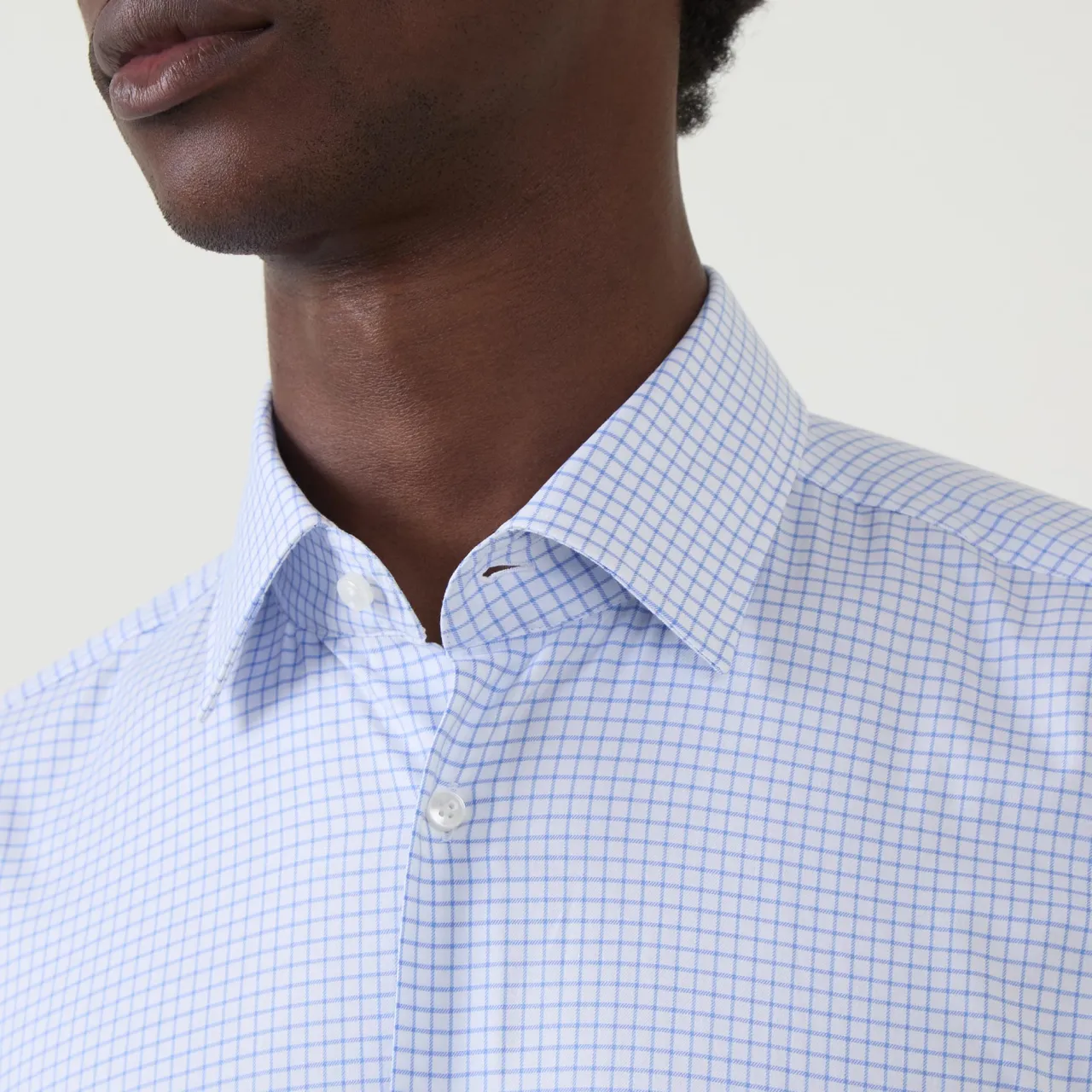 - Grid check pattern, spread collar, button fastenings, single cuffs