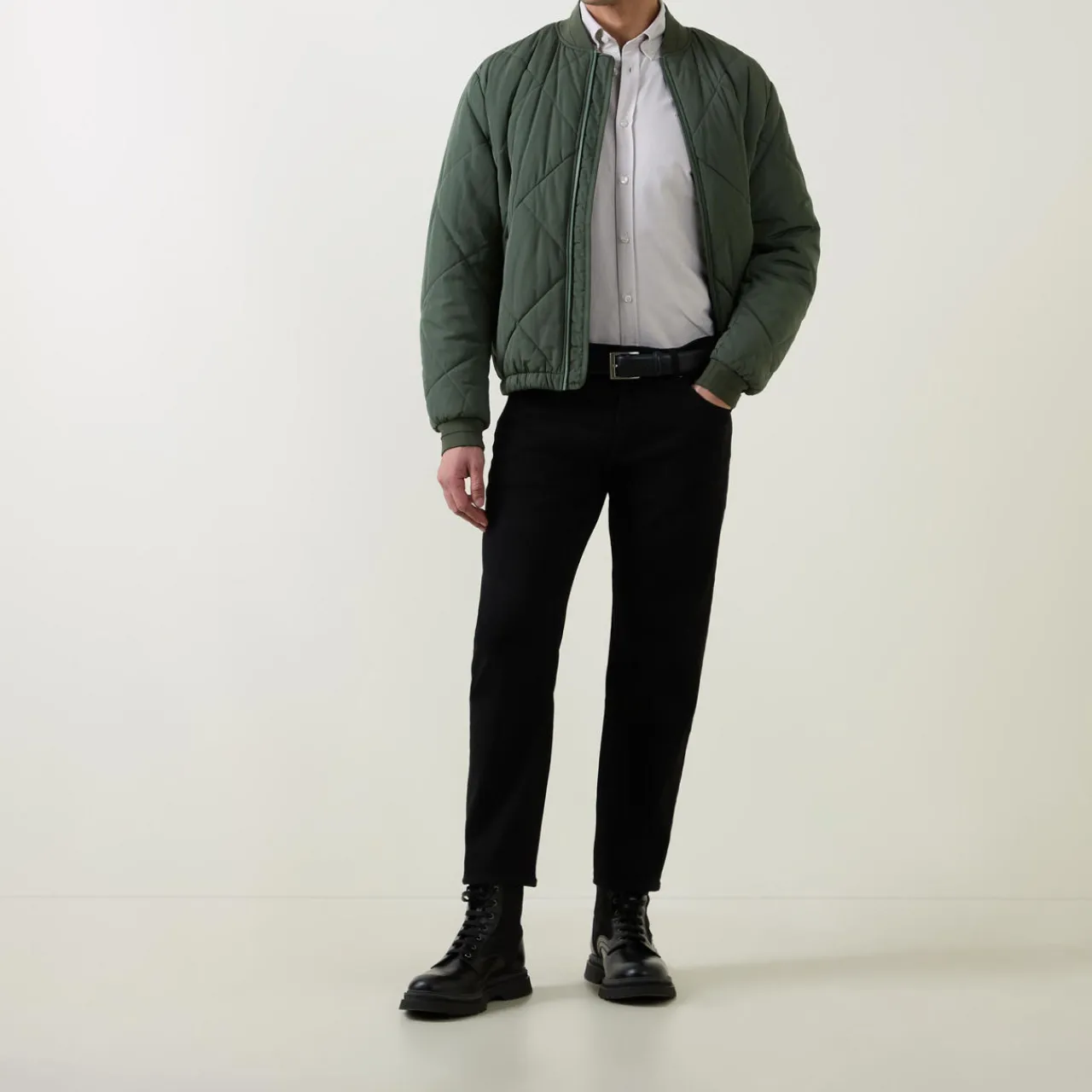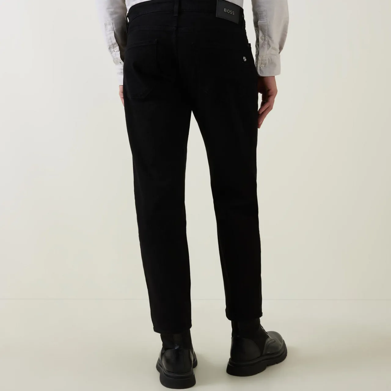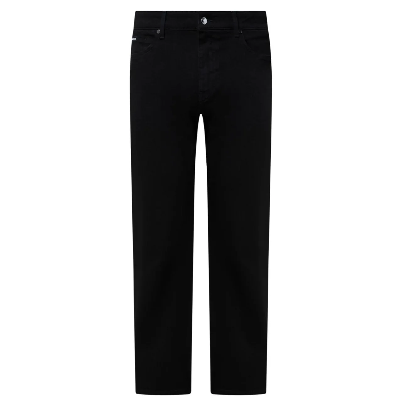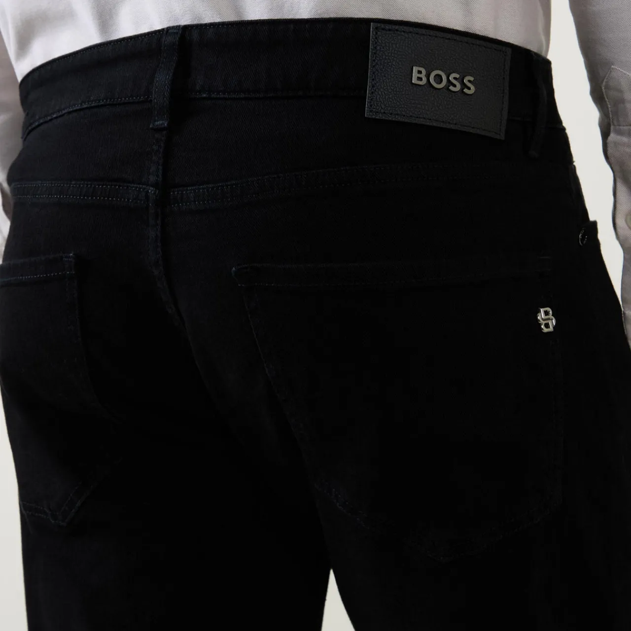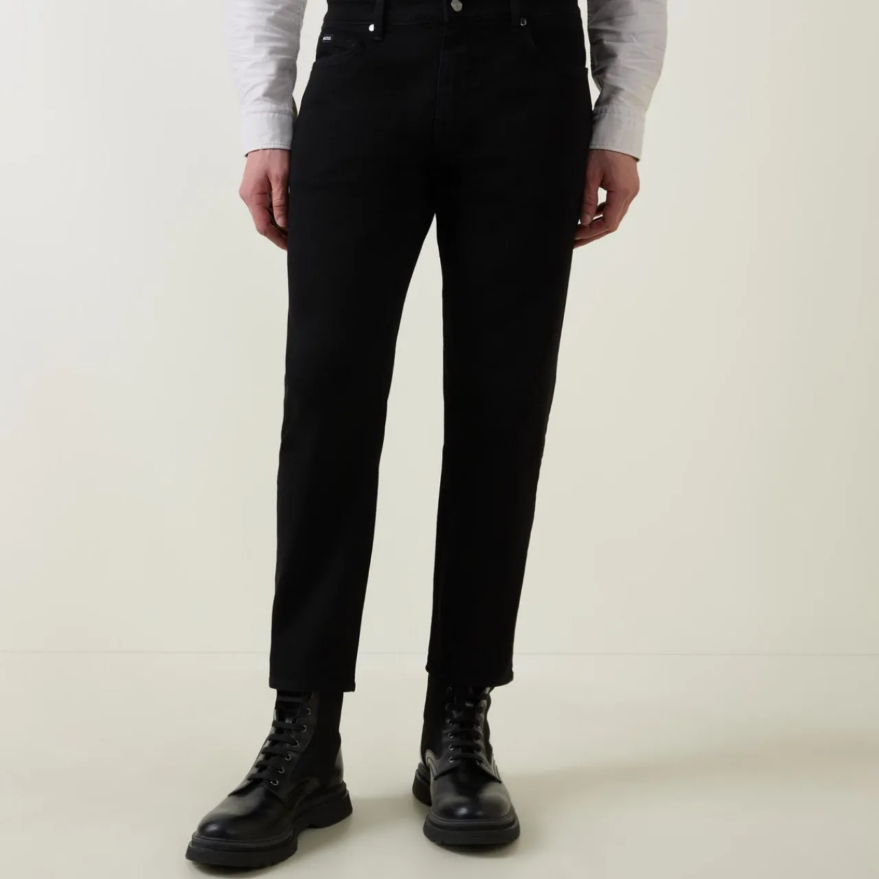 - Mid-rise, slim leg, belt loops, concealed fly with button fastening, five-pocket styling, clean hems, logo detail, dark finish