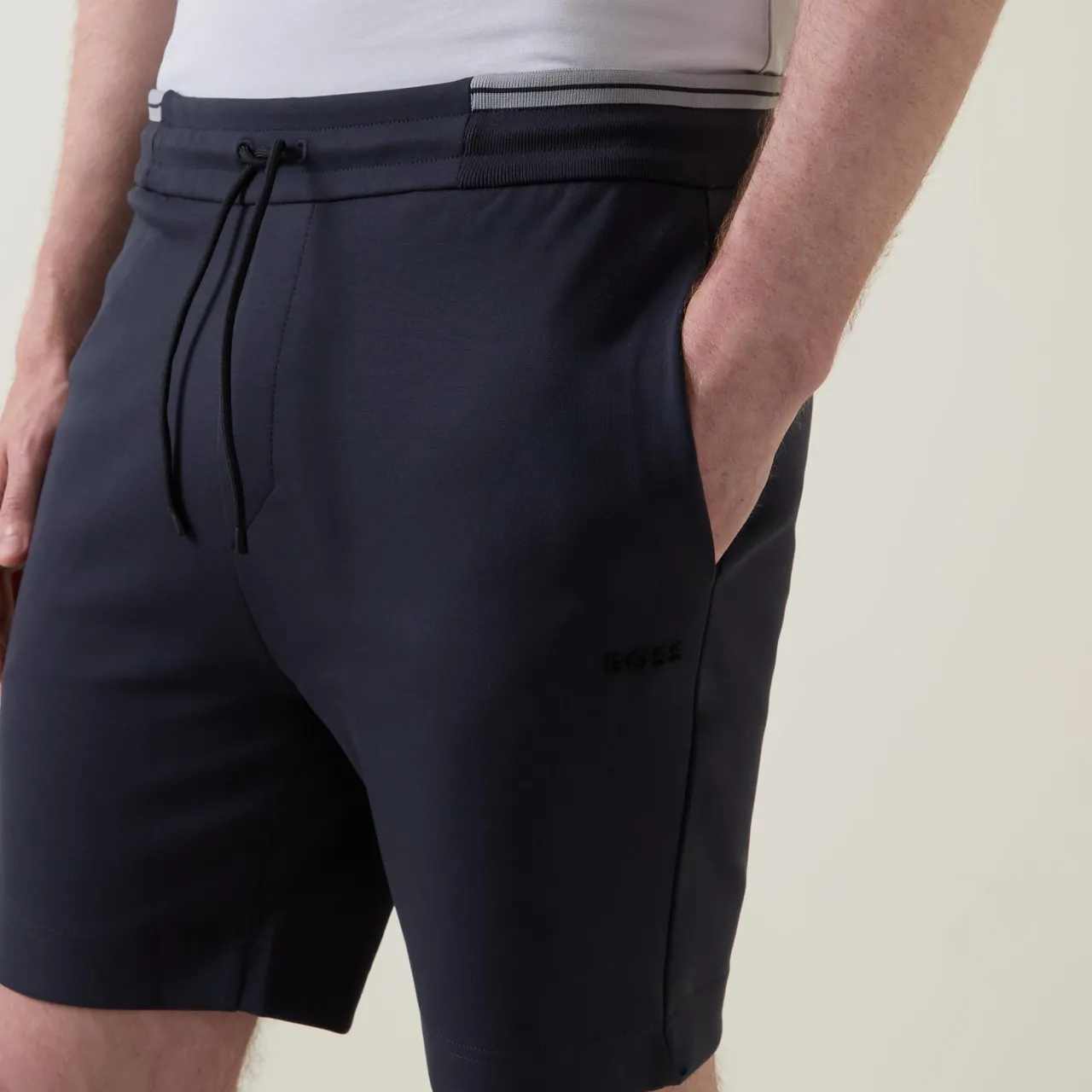 - Elasticated waist, drawstring fastenings, logo detail, side pockets, striped detail on waistband