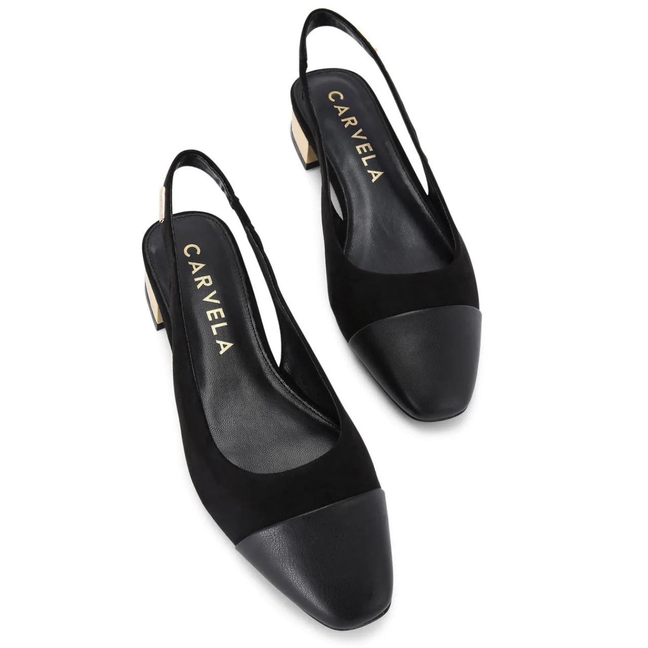 - Slingback silhouette, almond toe, microsuede upper, patent toe cap, elasticated strap, slip-on style, gold-tone branding details, metallic block heel