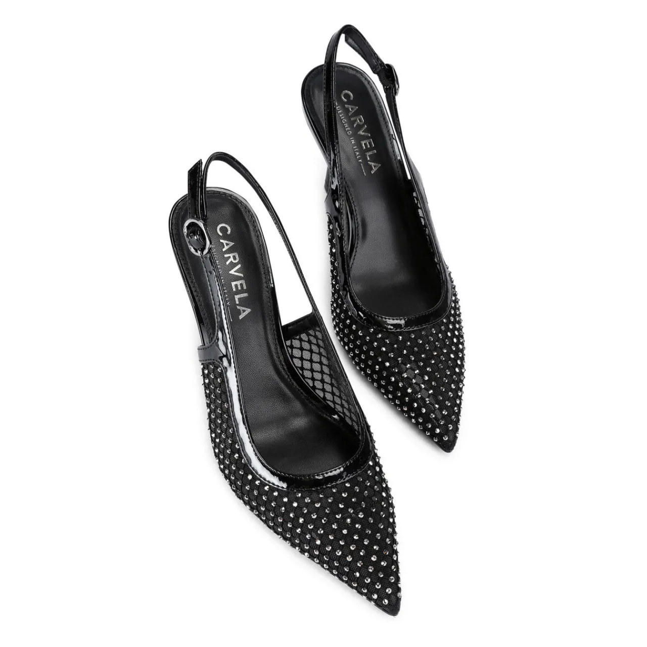 - Mesh pointed toe, crystal embellishment, slingback ankle strap, gunmetal branded buckle