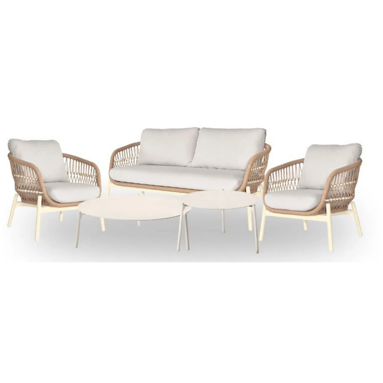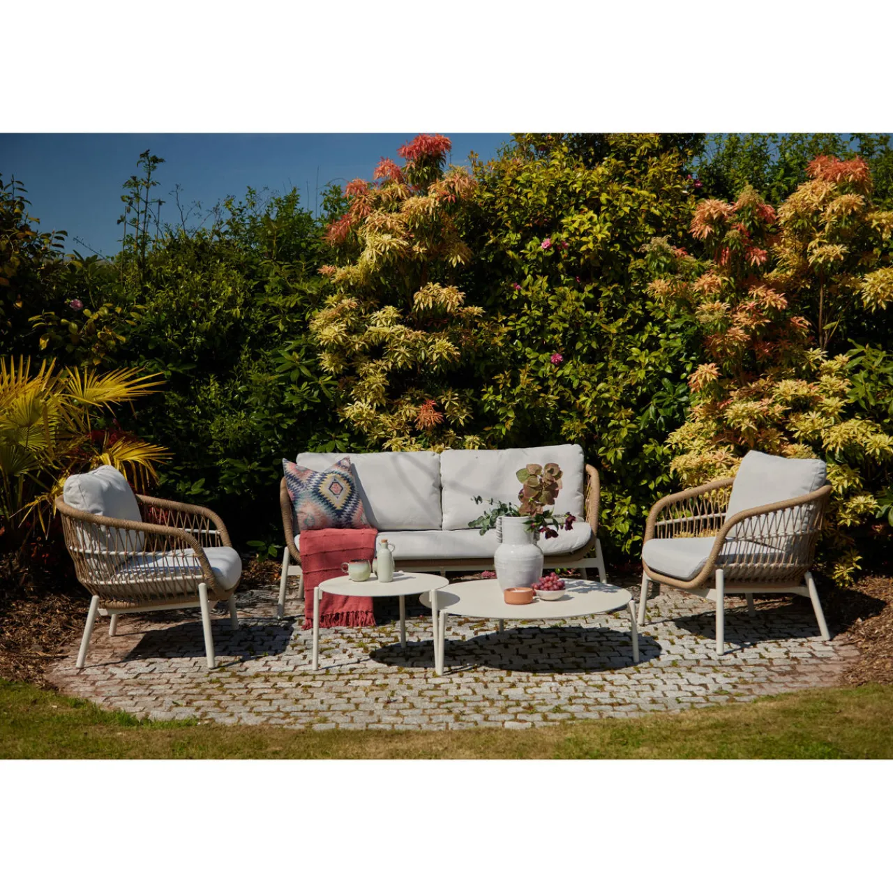- Composition: Rattan, powder-coated aluminium, natural rope, polyurethane foam, acrylic fibres