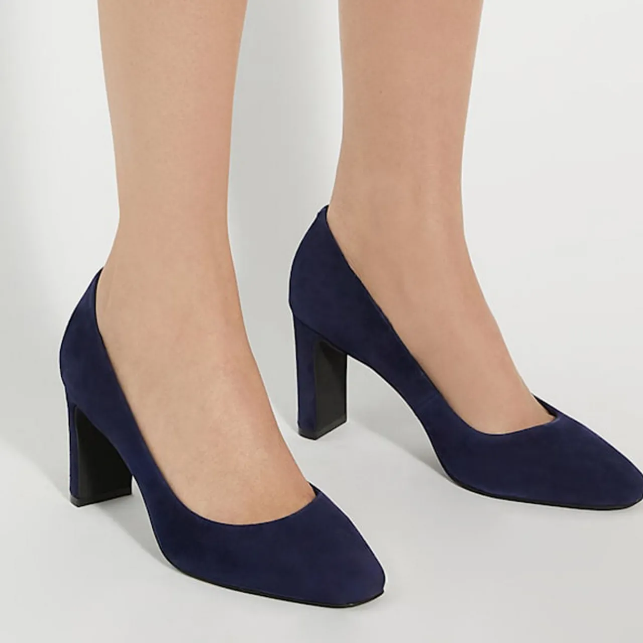 - Squared toe, low vamp, padded insole, block heel, logo hardware at insole, textured finish