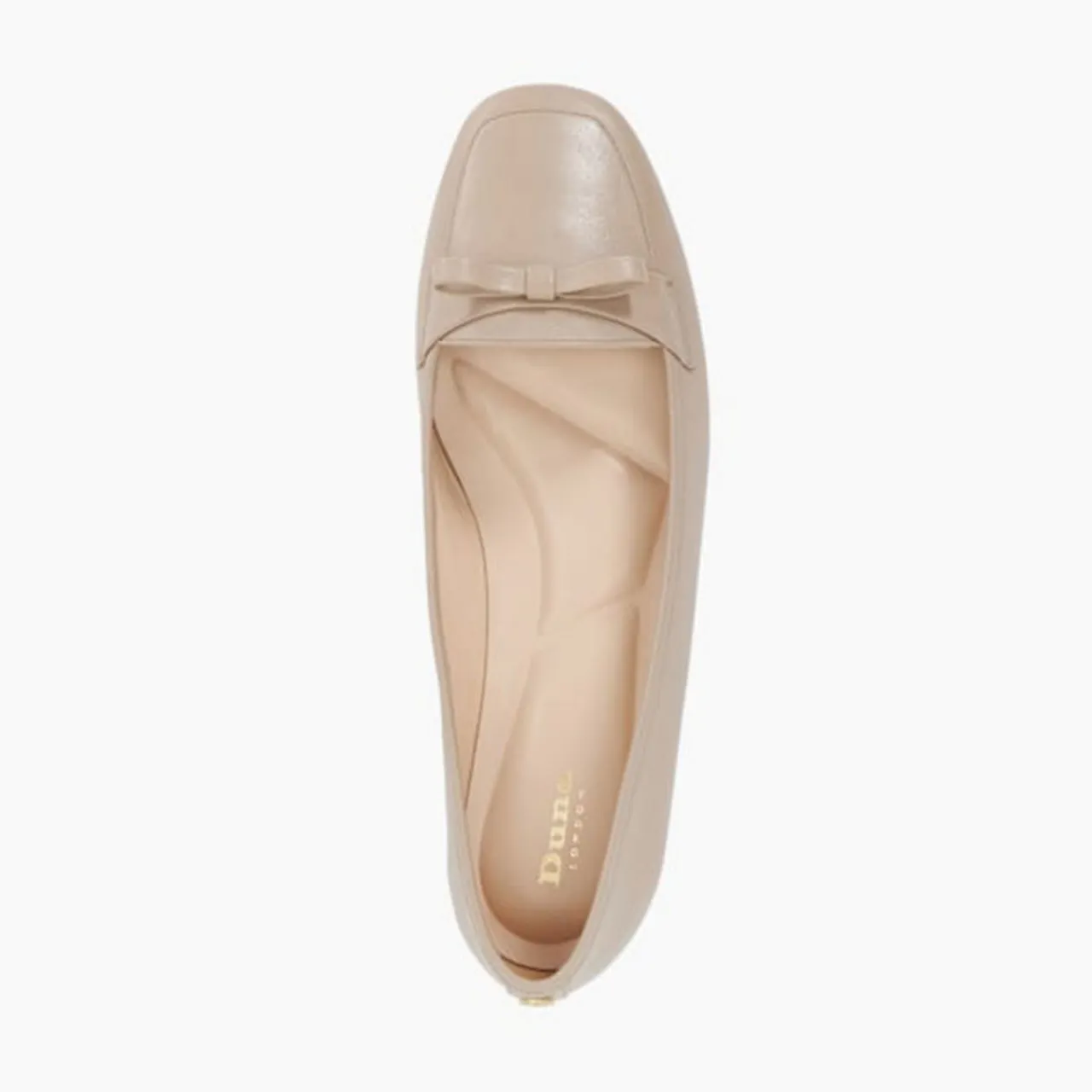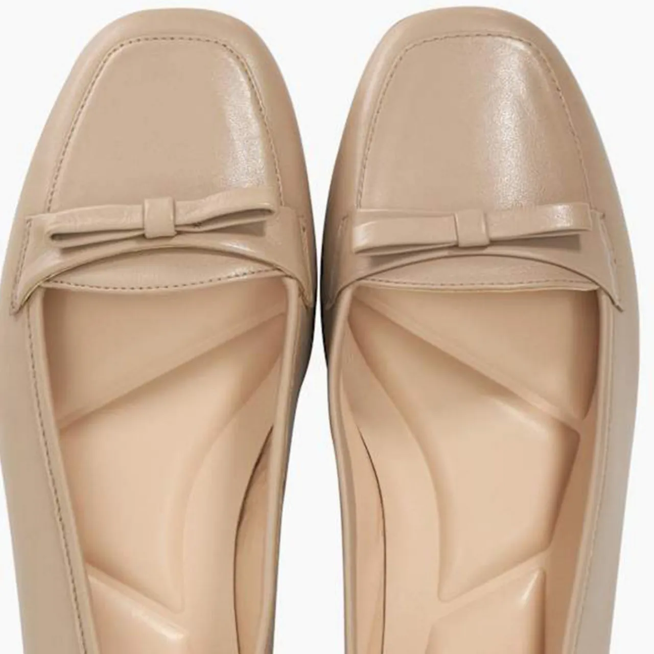- Square toe, flat heel, slip-on style, front bow detail, tonal stitching, smooth leather finish