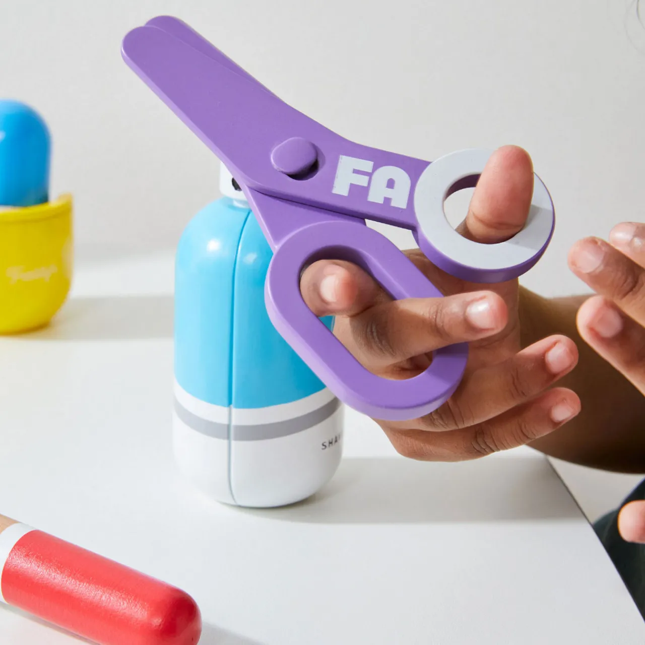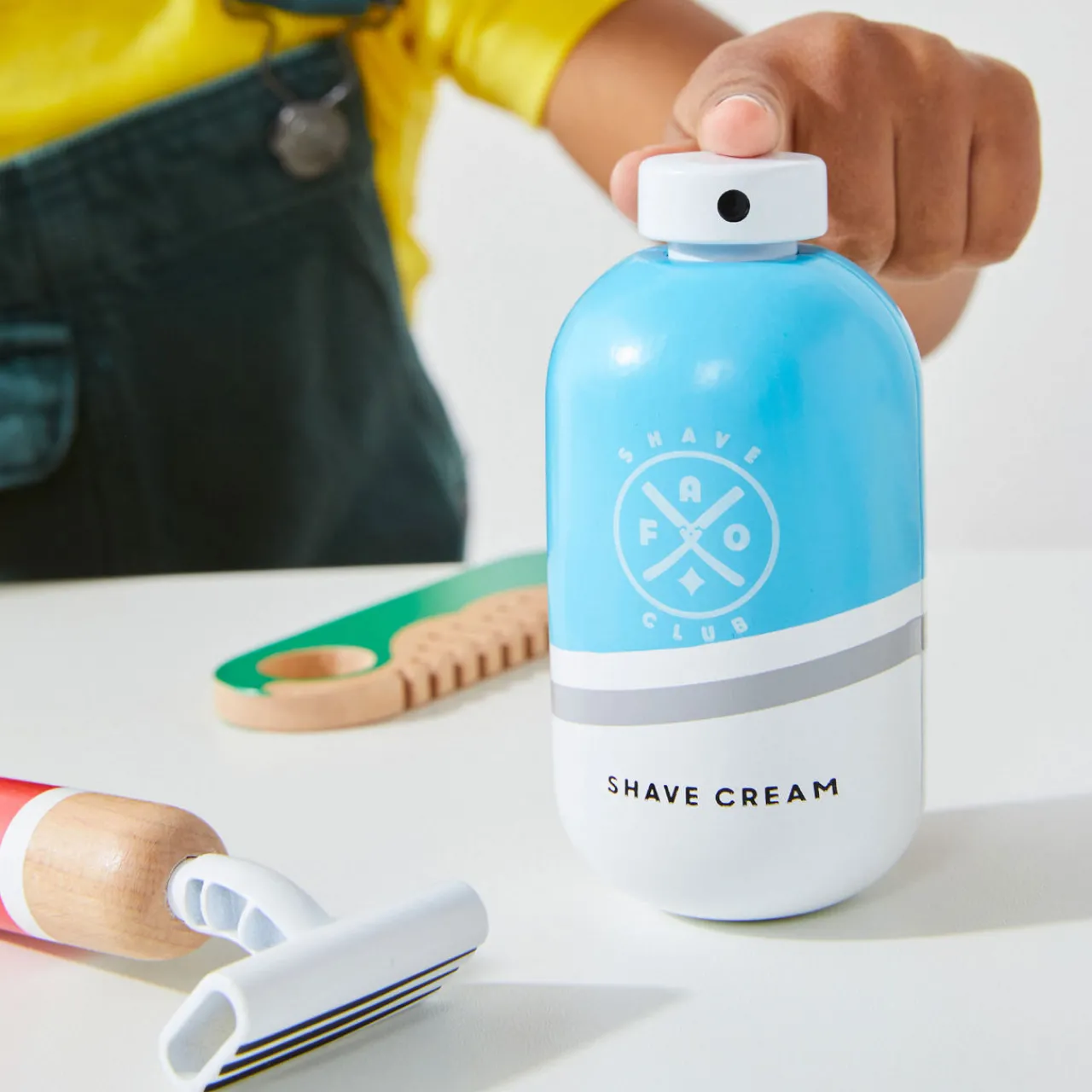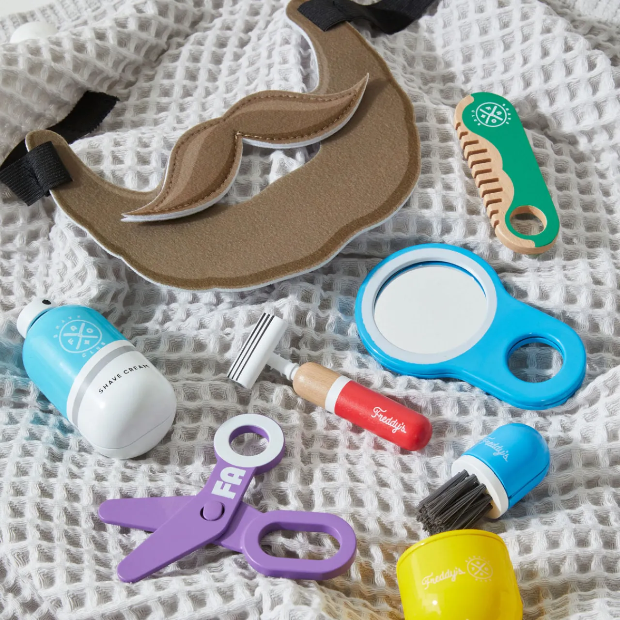 - 10 piece set including play scissors, play razor, play shaver, play shaving brush and holder, storage bag, faux beard, play mirror and more