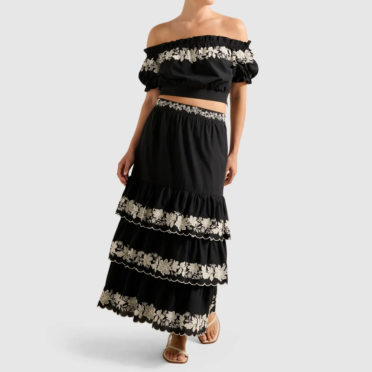 - High-rise waist, tiered design, embroidery detail, flared silhouette, concealed side zip fastening, fully lined