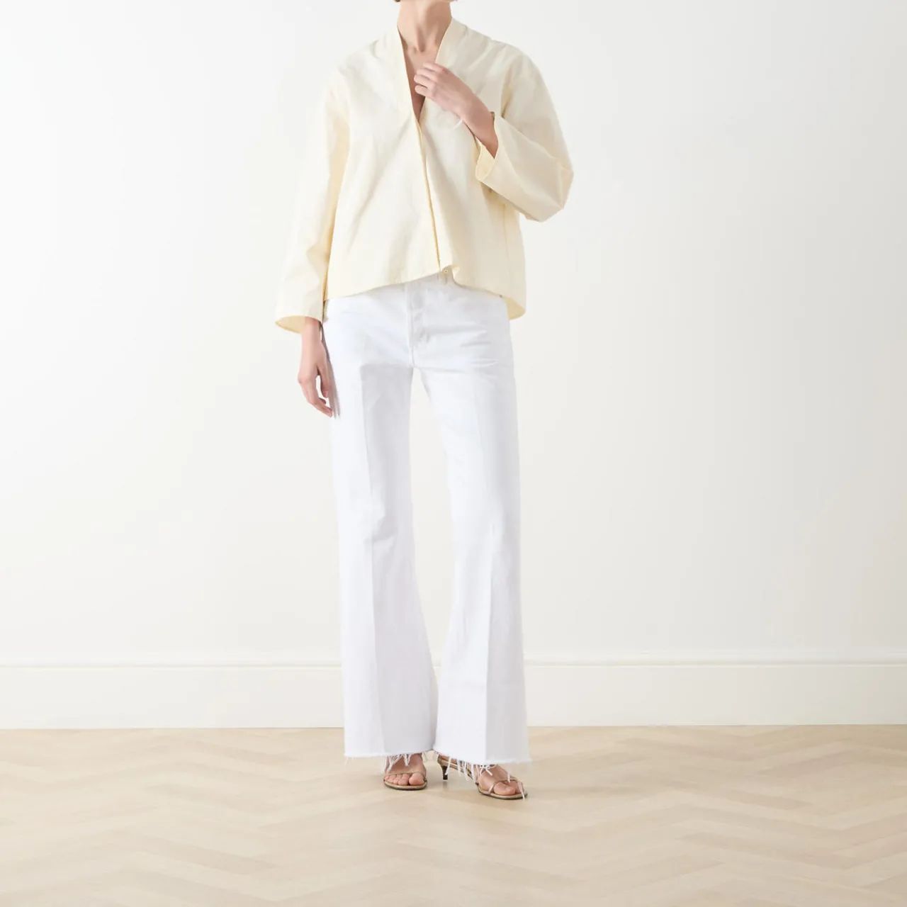 - High-rise, flared leg, full length, belt loops, concealed fly and button fastening, five-pocket styling, raw-edge hems, tonal stitching, rigid denim, vintage-inspired design
